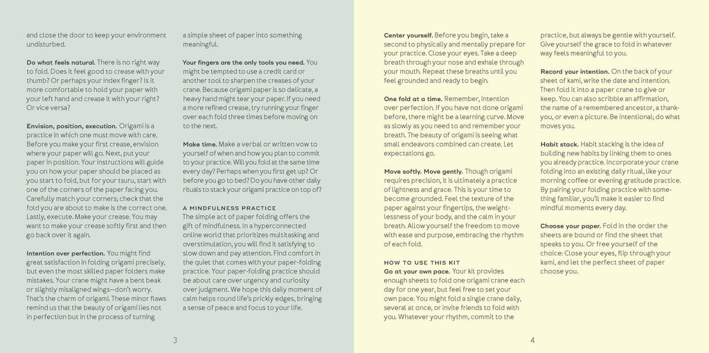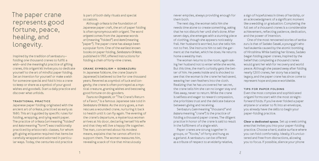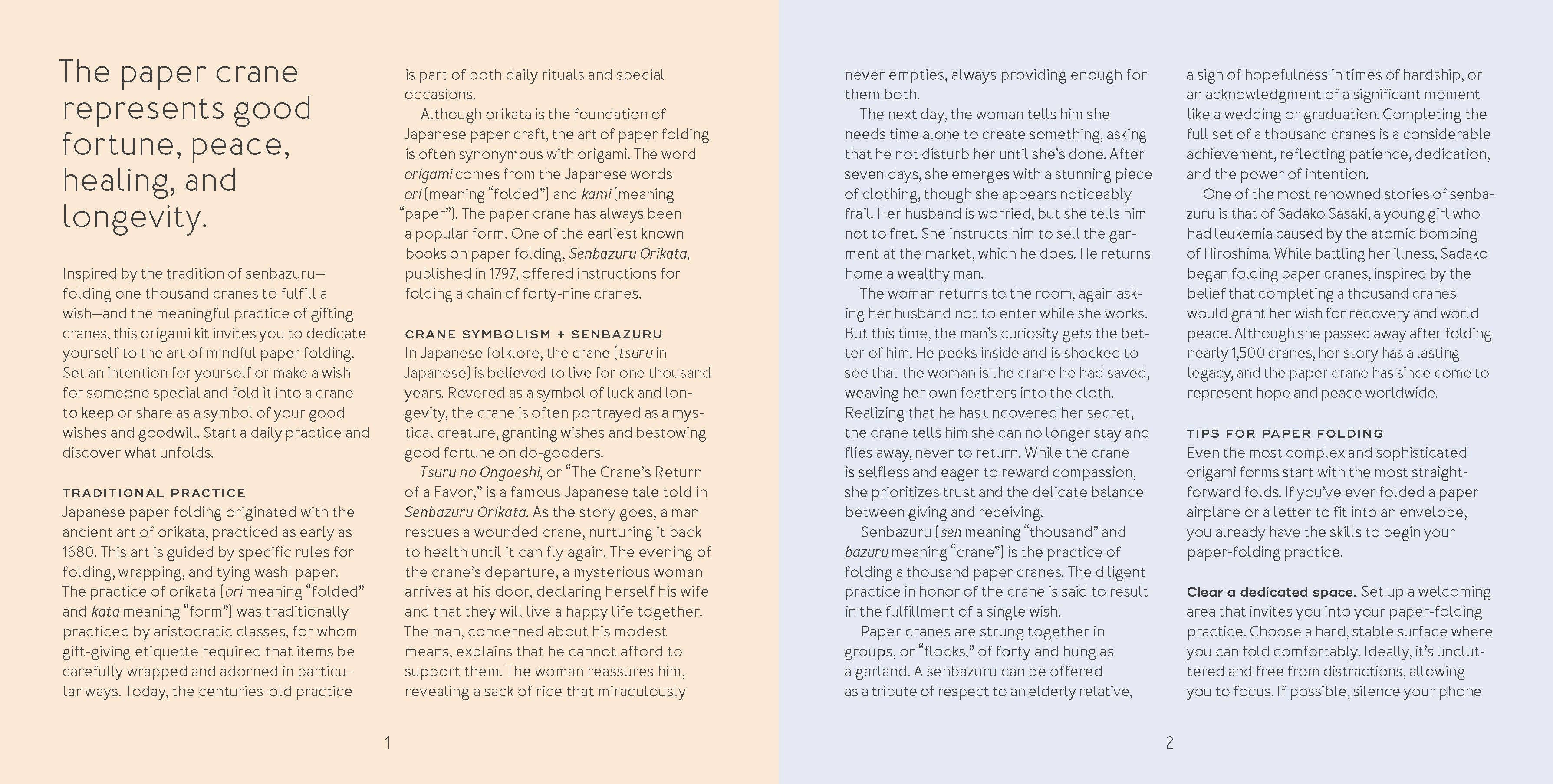 Paper cranes are a symbol of longevity, peace, hope, healing, and good fortune, and gifting them is a gesture of goodwill. Inspired by the tradition of 1,000 paper cranes, this beautiful origami set helps you create a ritual of folding a paper crane every day. Packaged like a traditional book with a tear-away notepad of origami paper and a removable booklet that includes folding instructions and information on the significance of paper cranes, this stunning object celebrates mindfulness, intention setting, and gift-giving.