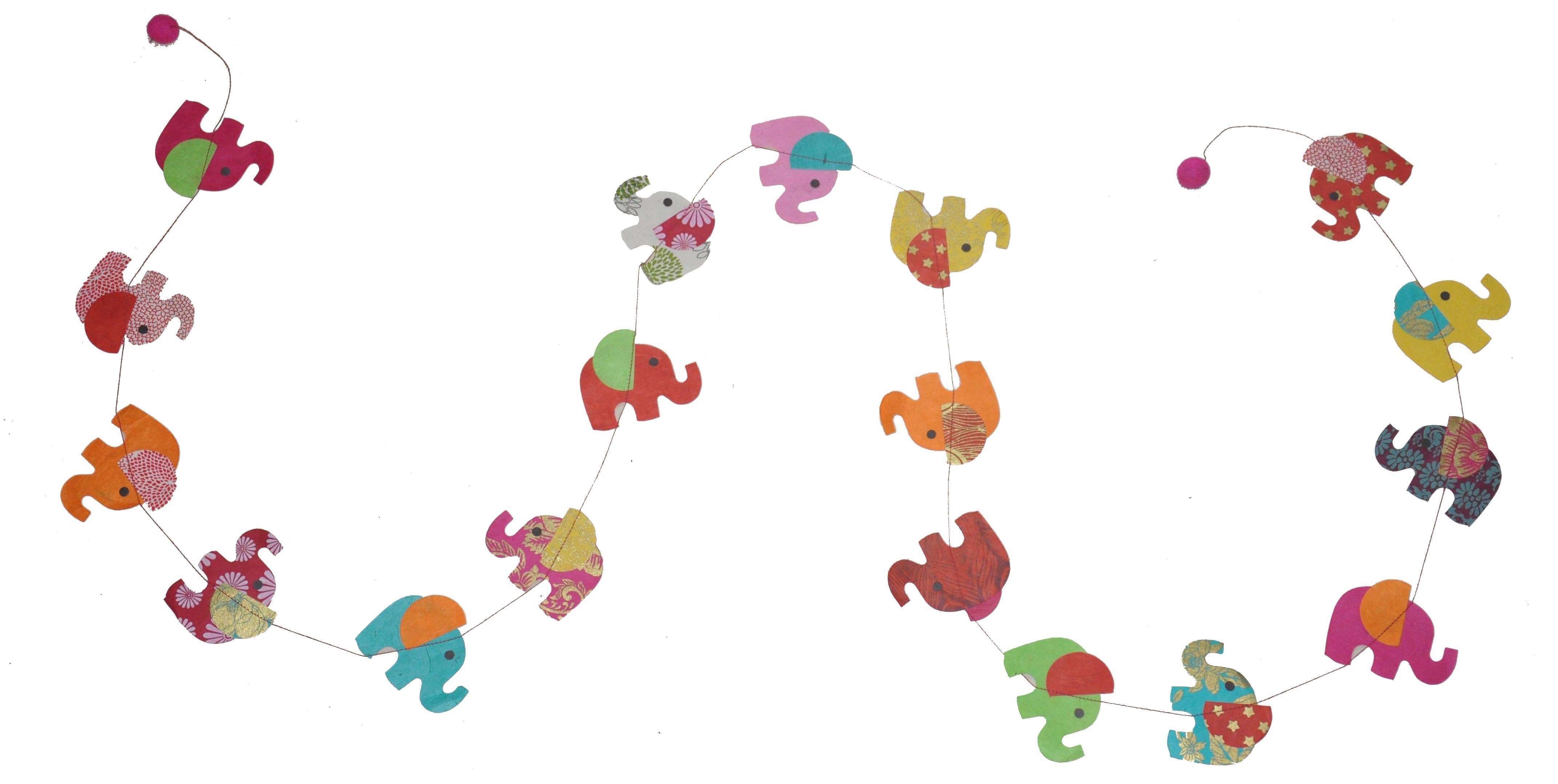 Assorted patterned paper is die cut and then stitched together to create beautiful paper garlands. These garlands are fairly traded products made by women-cooperatives using local raw materials and scrap papers.