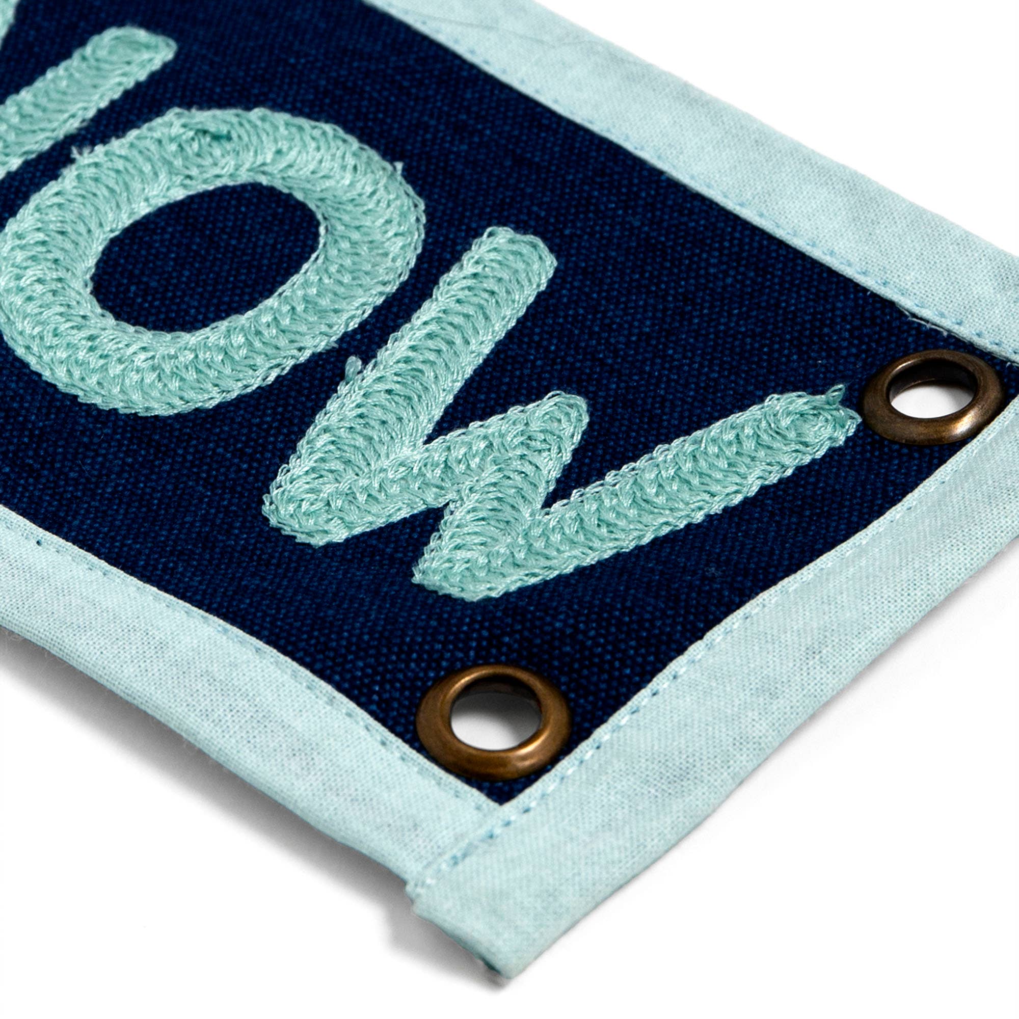 Features | Canvas banner, chain-stitched embroidery, brass grommets, canvas hem edge