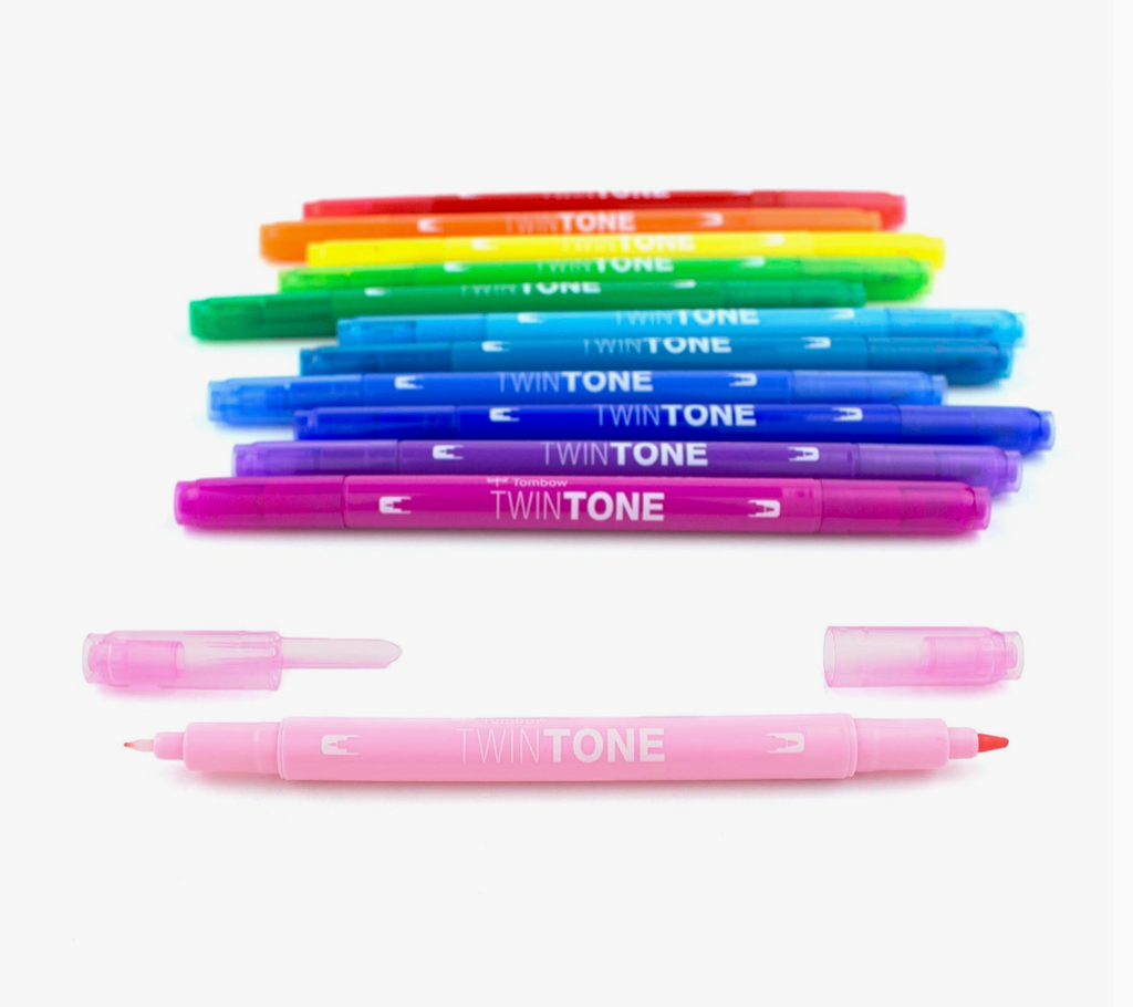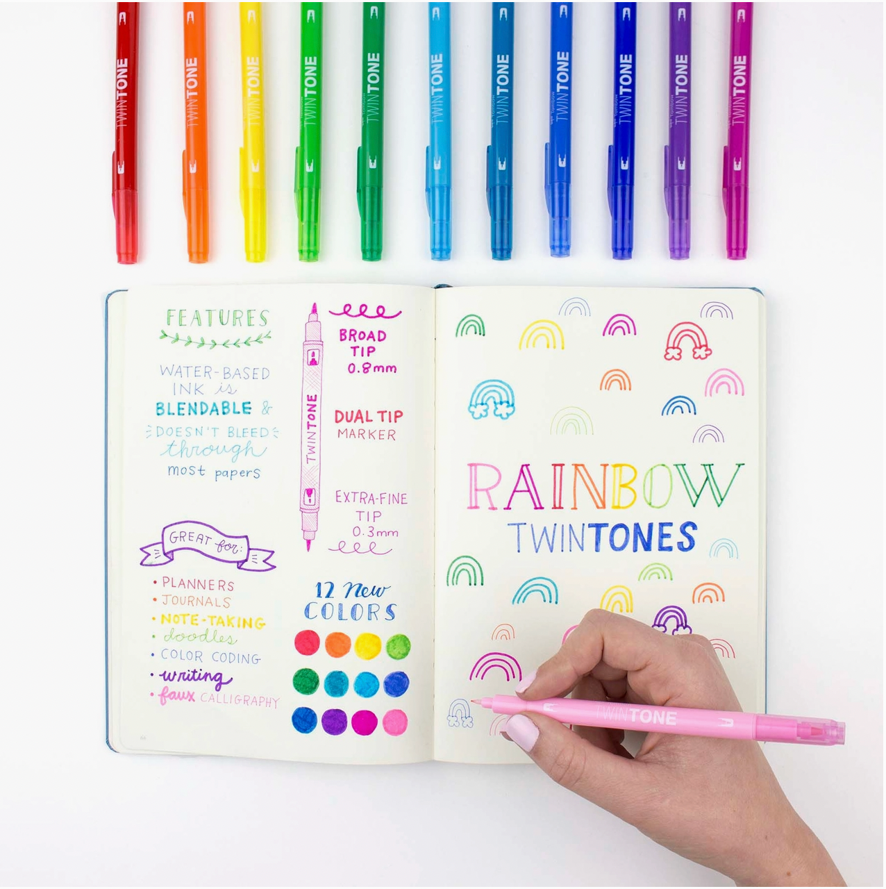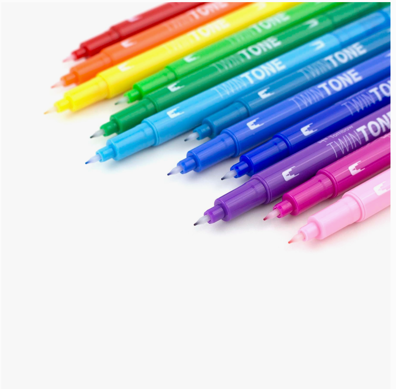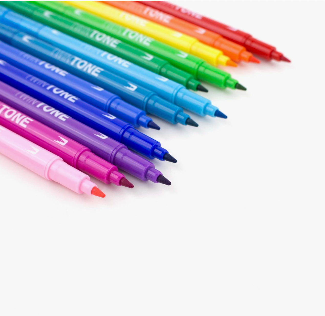 Dual tip markers .. broad bullet and extra-fine tips for creating thick or thin lines. Perfect for coloring. Water-based ink. 12 vibrant colors