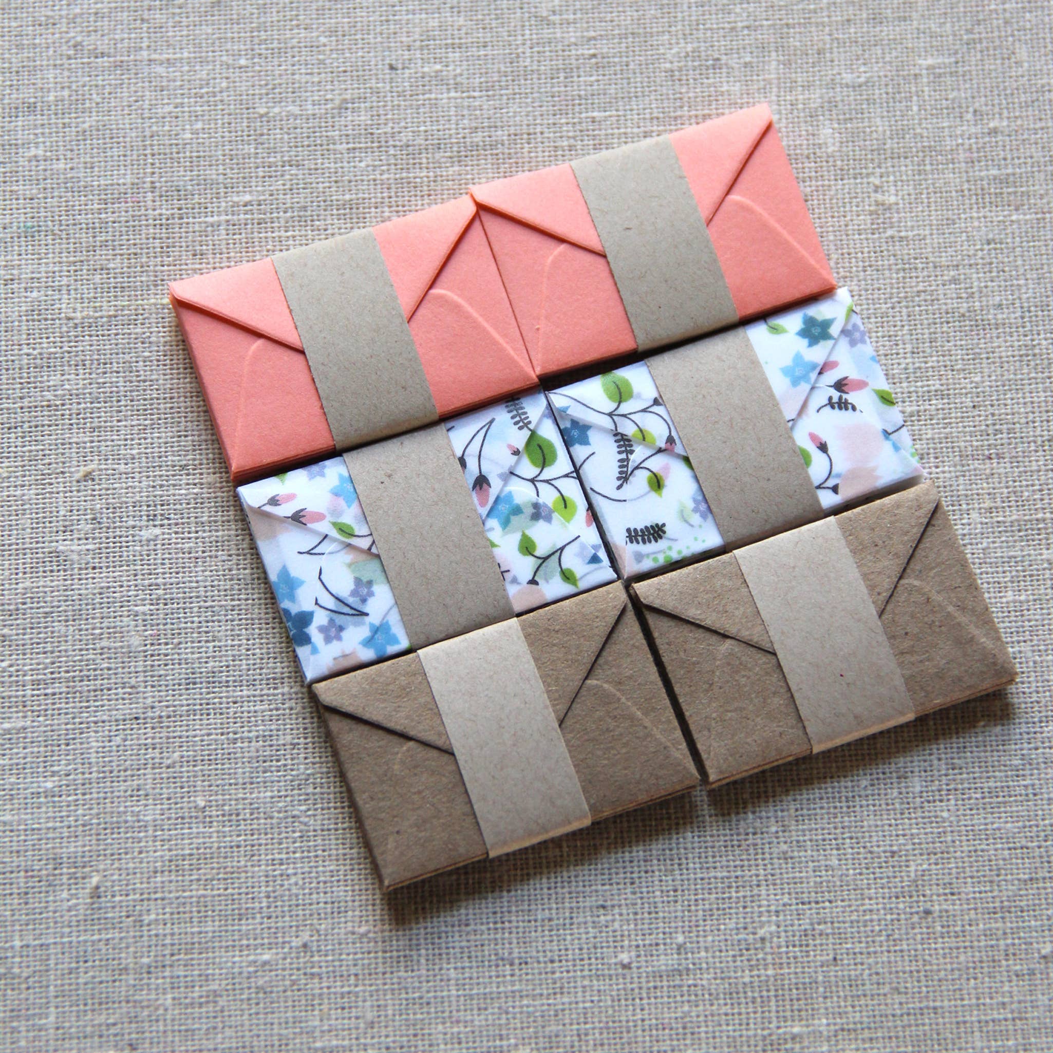 Set of 12 tiny envelopes, hand assembled from LDP's own patterned paper - hand drawn illustrations of botanicals printed on vellum paper, kraft brown and coral paper.