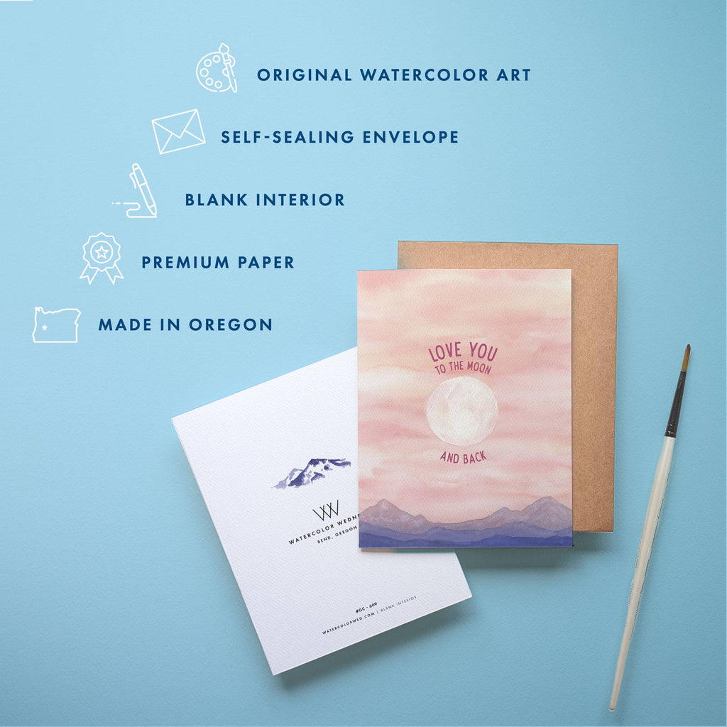 A dreamy card for deep love and soft skies. This hand-painted design features a full moon rising over layered mountain silhouettes, paired with the sweet phrase "Love you to the moon and back." Perfect for expressing love on Valentine’s Day, anniversaries, or anytime a little moonlight magic is in order. Great for gift shops, bookstores, or boutiques with a romantic and uplifting vibe.