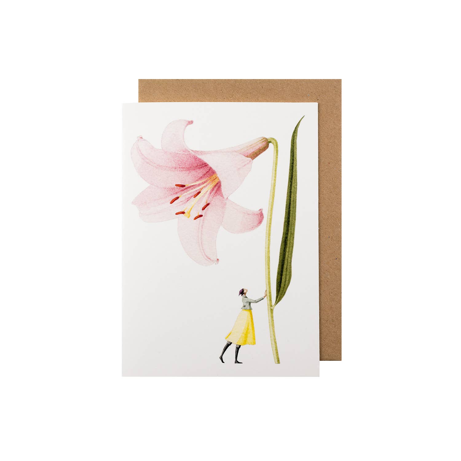 This lovely pink lily greeting card, illustrated by Laura Stoddart, features a beautiful botanical motif sure to brighten anyone's day. Perfect for any occasion, its unique design is sure to make it a treasured keepsake. 5 x 7" greeting card presented with kraft paper envelope.