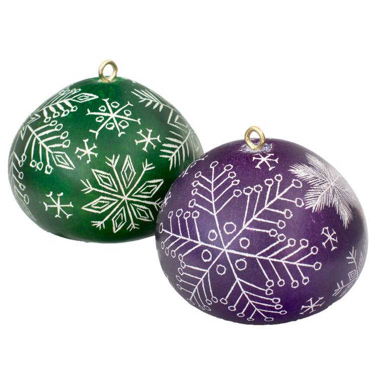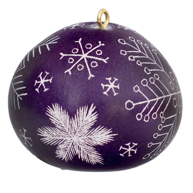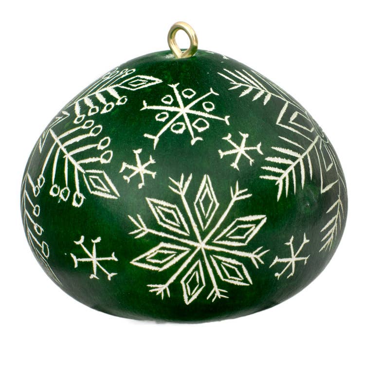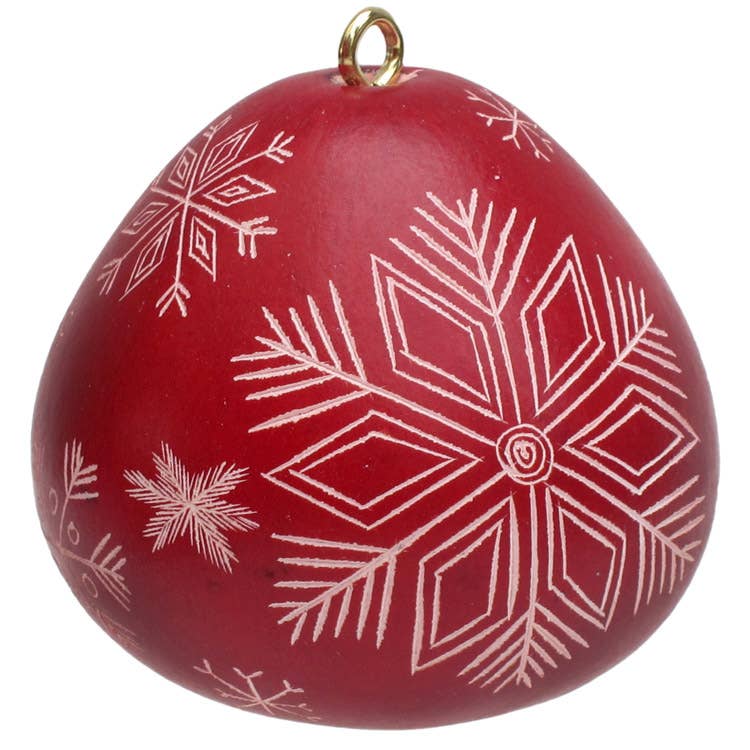 Tiny gourds have been transformed into beautifully handcrafted snowflakes! Celebrate the snow season and hang these simple ornaments from your tree--or share the magic feeling and use them as stocking stuffers! Designed and hand-crafted by artists in Peru, our gourd ornaments bring a modern flair to a 4,000-year-old traditional carving and burning technique. Each one is hand- carved and burned by one of our fine artists in Peru. They average 1.5”-1.75” tall. Details vary as nature and the artist intended. Price displayed is for one ornament. Size: 1.75" - 2" artist made holiday and xmas gift ideas