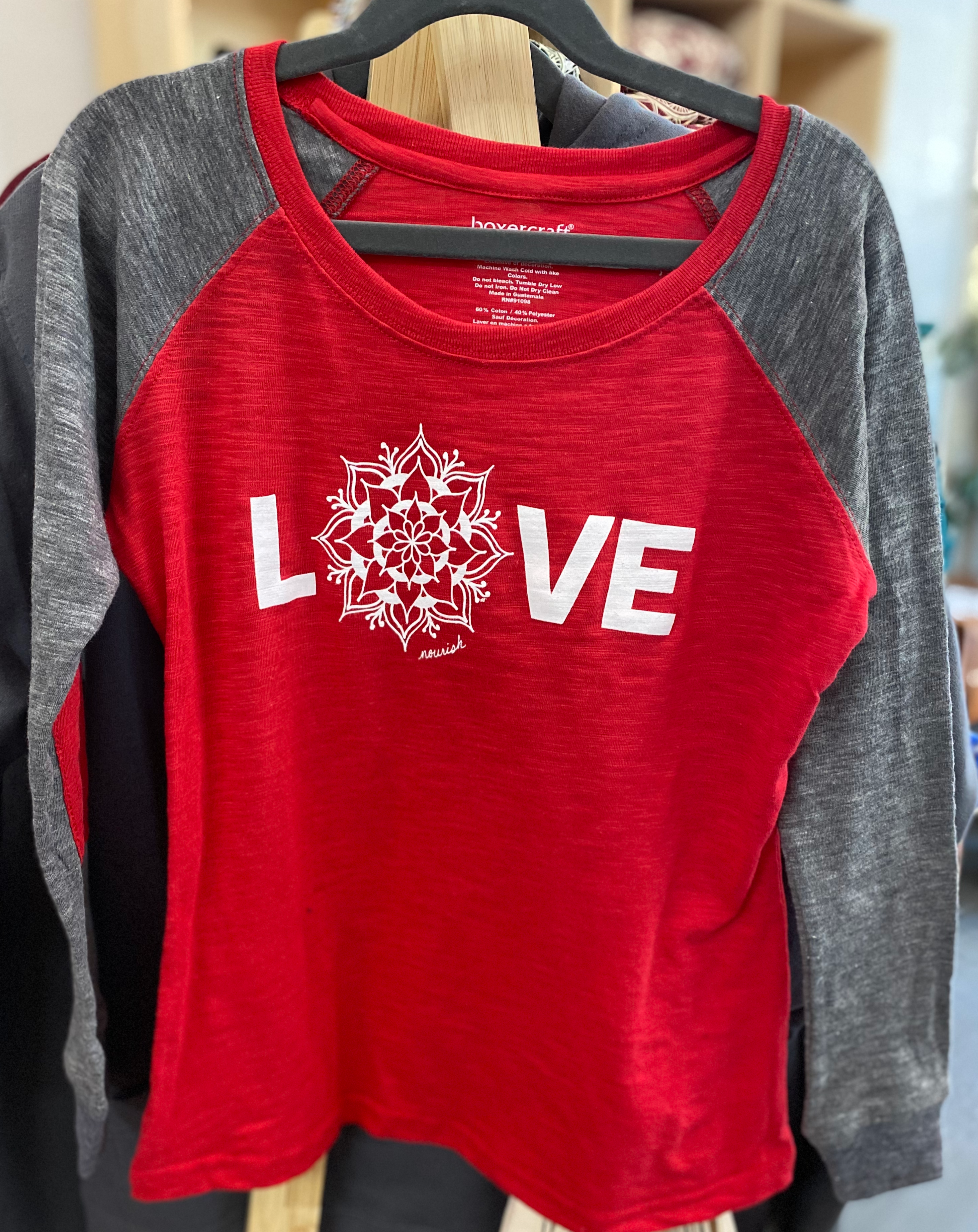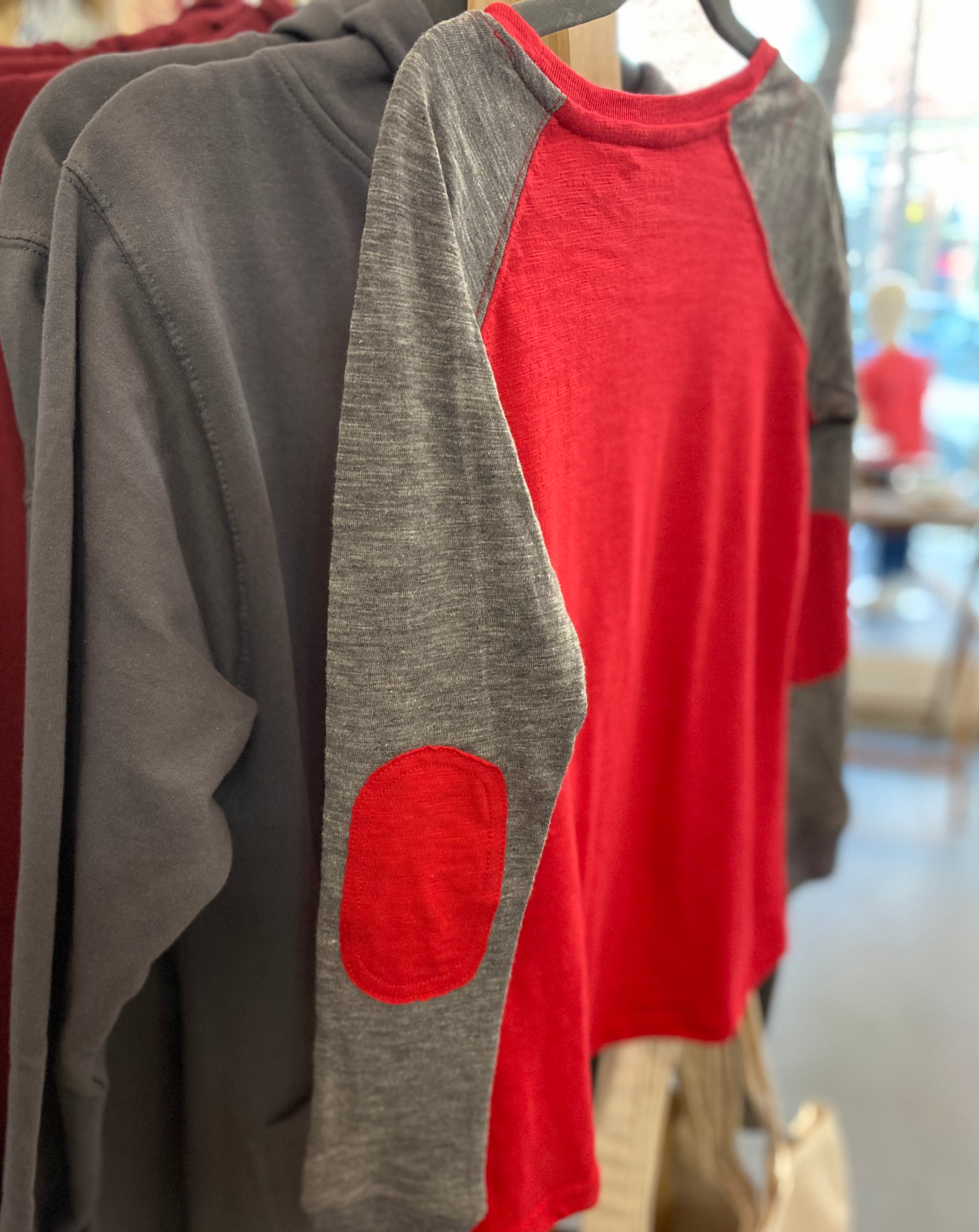 You can't go wrong with LOVE! This shirts has a longer hem And it ncute red elbow patches!!