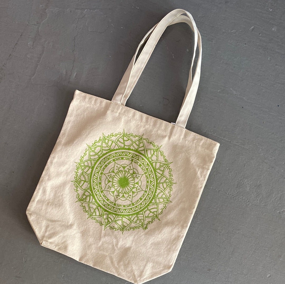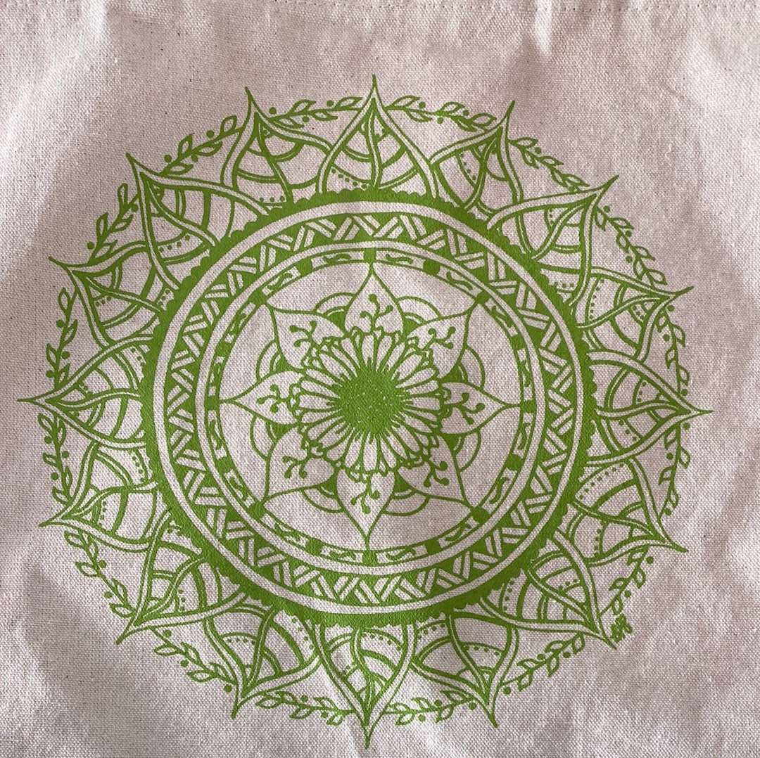 A roomy tote with nice long handles featuring an original, hand-drawn mandala design inspired by a flower and leaves. The uses for this bag are endless... school work, groceries, library books, knitting projects, toys....the list goes on and on.