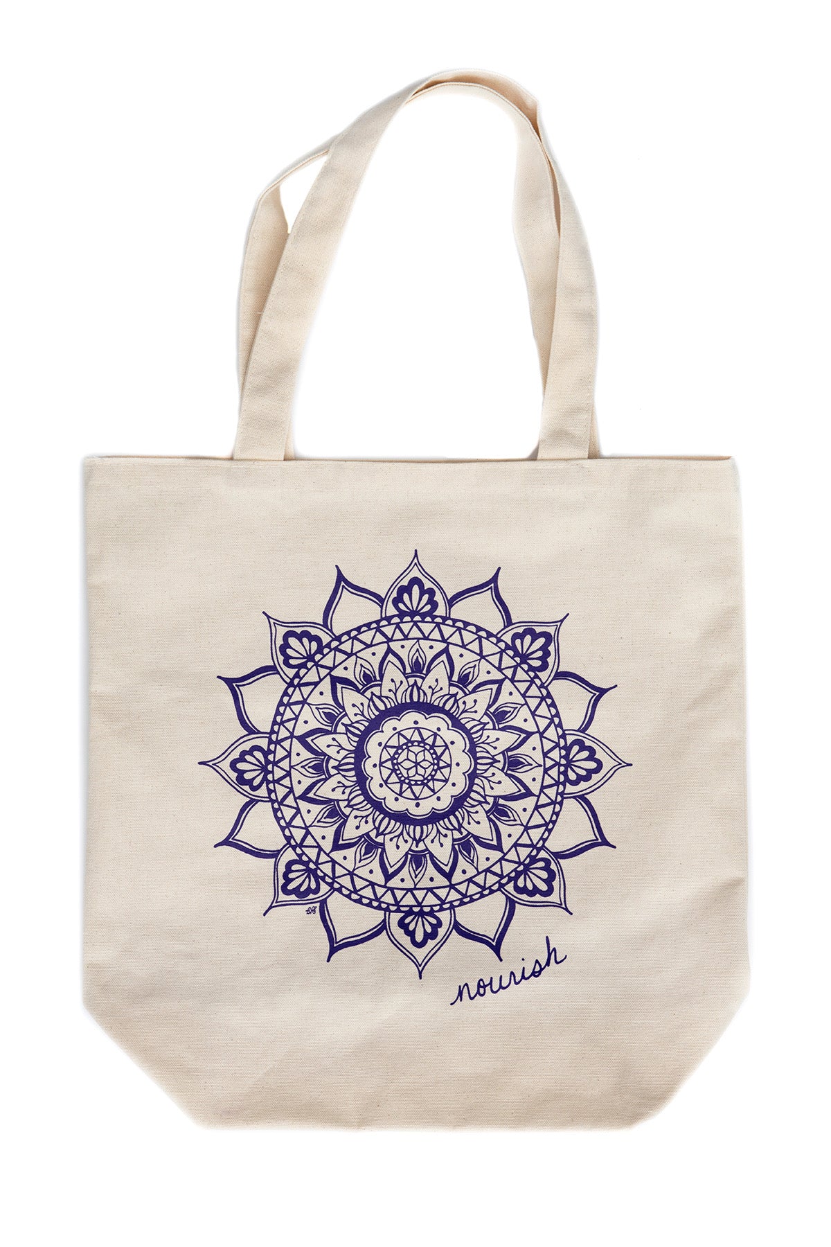 A roomy tote with nice long handles featuring an original, hand-drawn nourish mandala design in purple. The uses for this bag are endless...groceries, library books, knitting projects, toys....the list goes on and on.