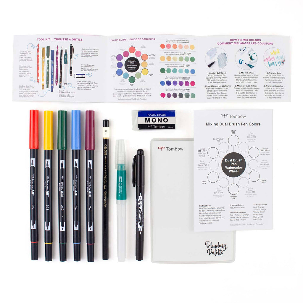 Learn to use Tombow Dual Brush Pens to easily create watercolor art with the Tombow Watercolor Set. Includes a pamphlet with helpful tips and all the tools you need to start blending and mixing colors. Each set includes 5 Dual Brush Pens, Medium Water Brush, MONO Drawing Pencil, MONO Twin Permanent Marker, MONO Plastic Eraser, Blending Palette, Watercolor Guide, and Mixing Chart. Dual Brush Pen Colors Included: 885 Warm Red, 993 Chrome Orange, 249 Hunter Green, 526 True Blue, 757 Port Red.