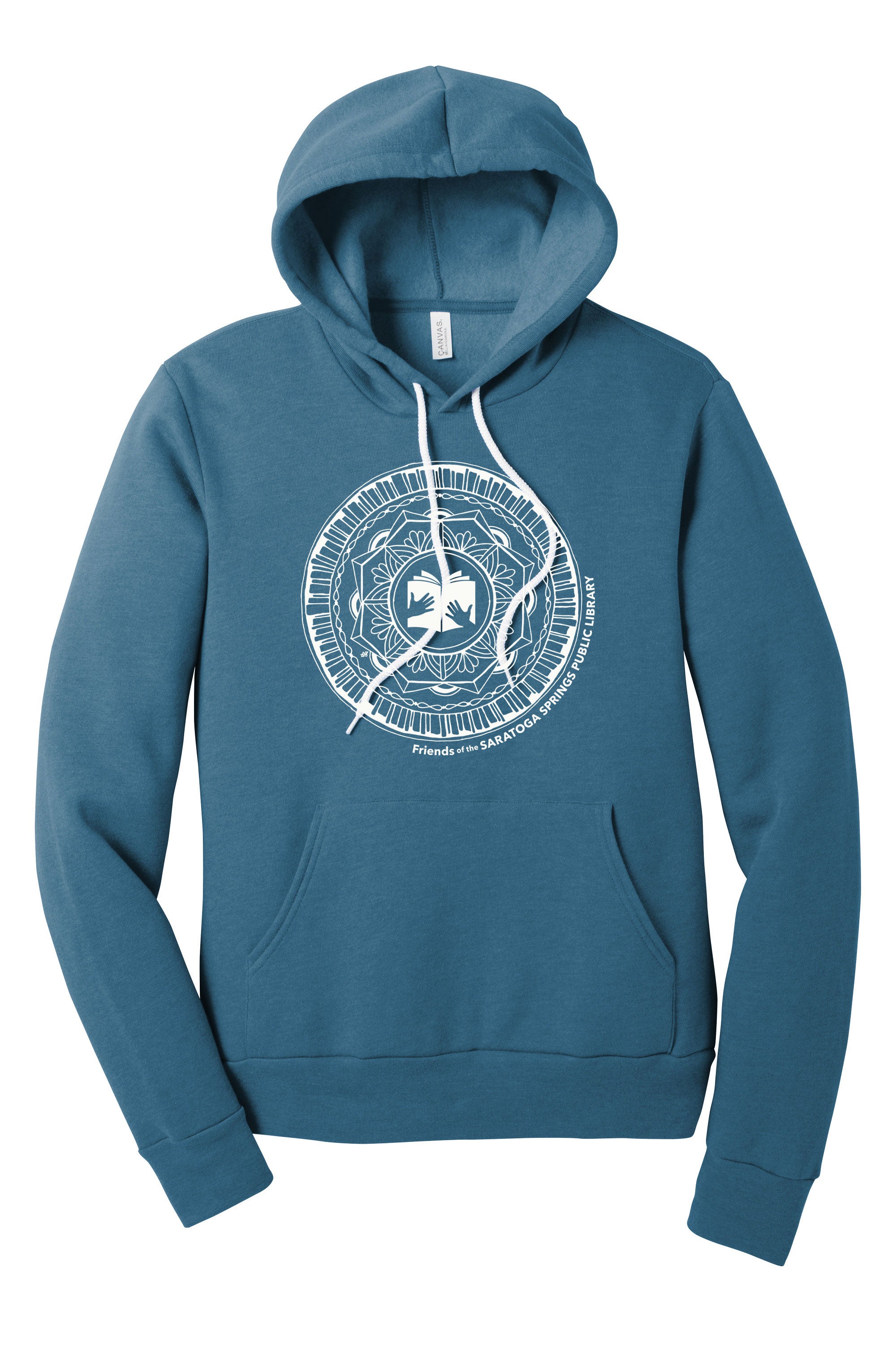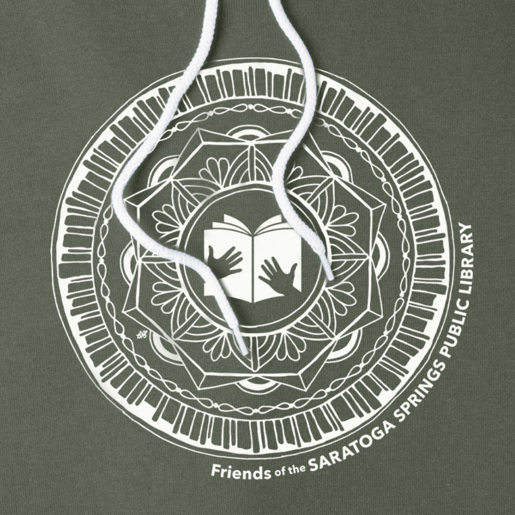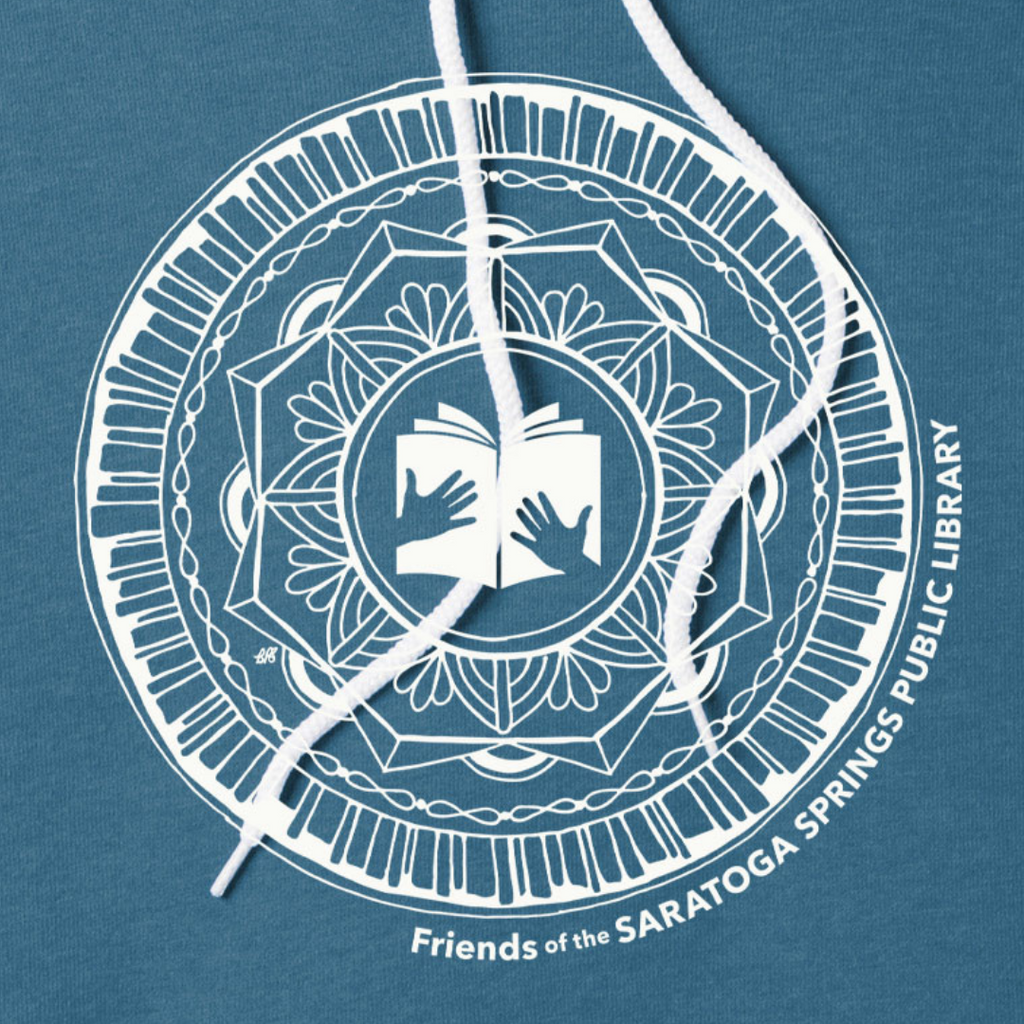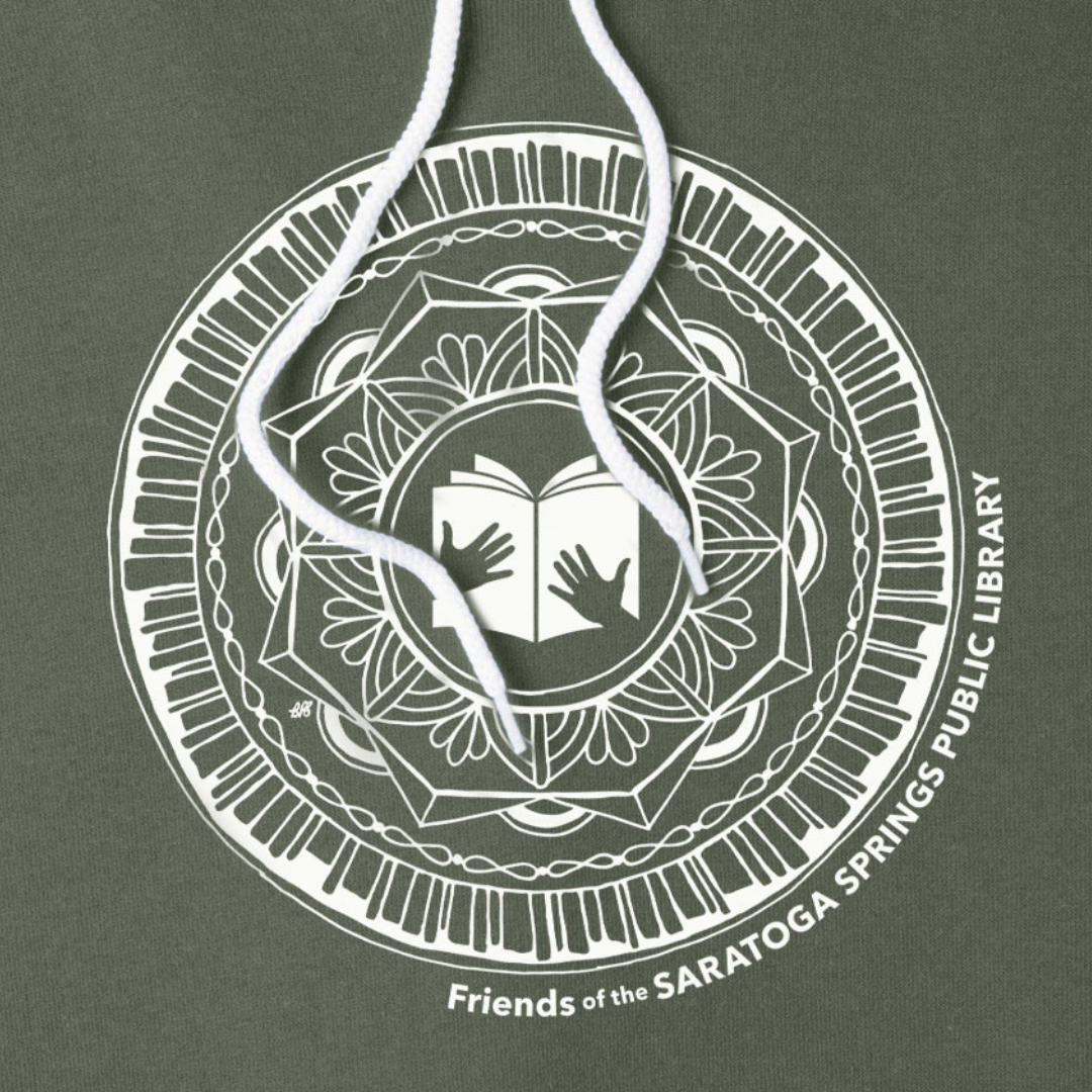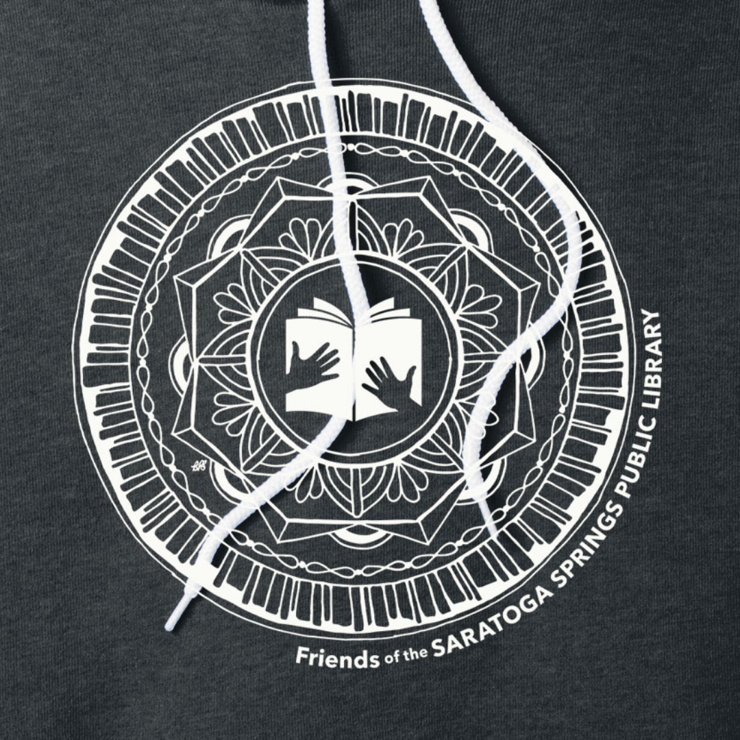 An original mandala design on a cozy hooded sweatshirt... super soft on the inside. A generously sized unisex sweatshirt. Rib knit cuffs and hem. Features an original Friends of Saratoga Springs Public Library design, by local artist, Betsy Seplowitz.