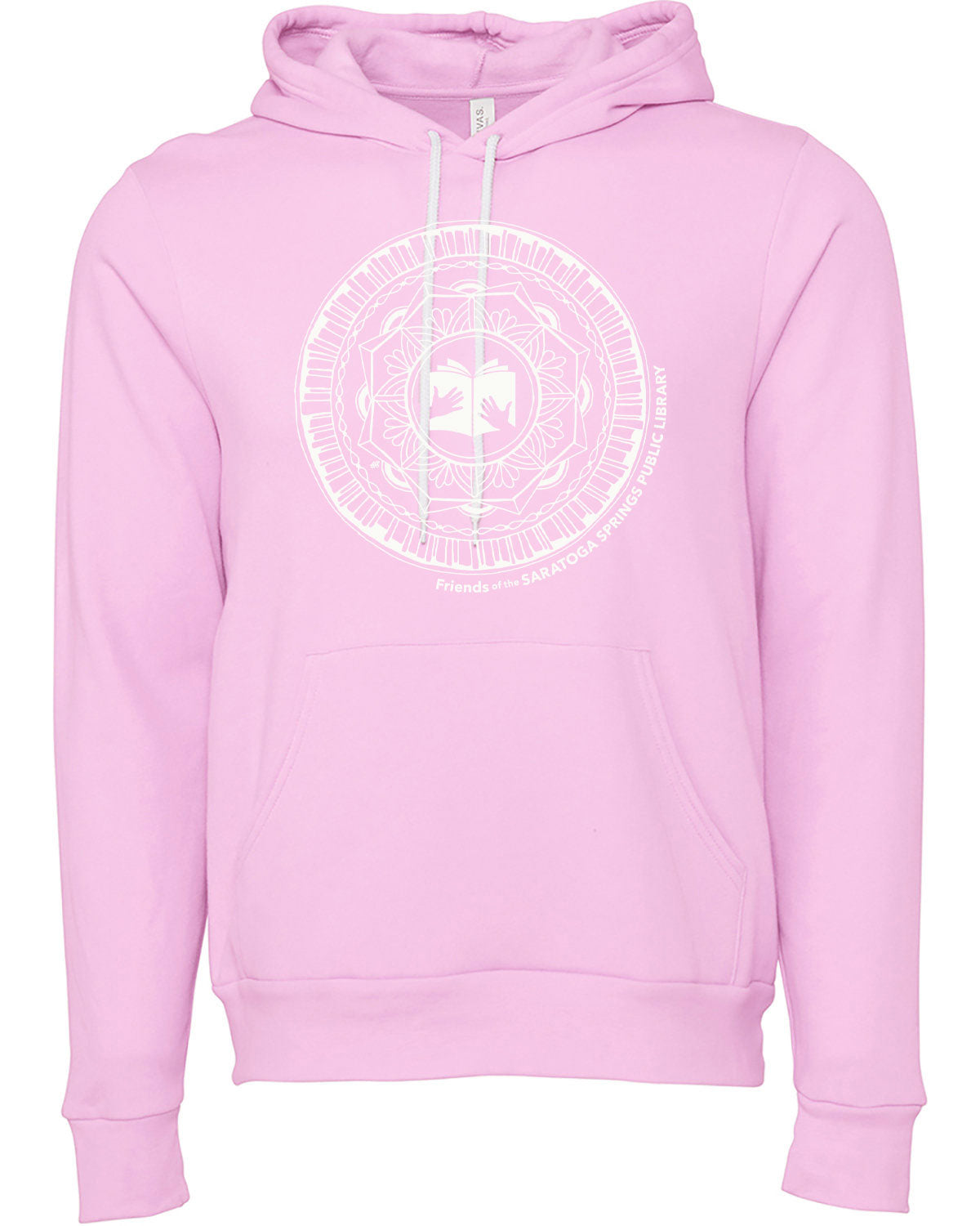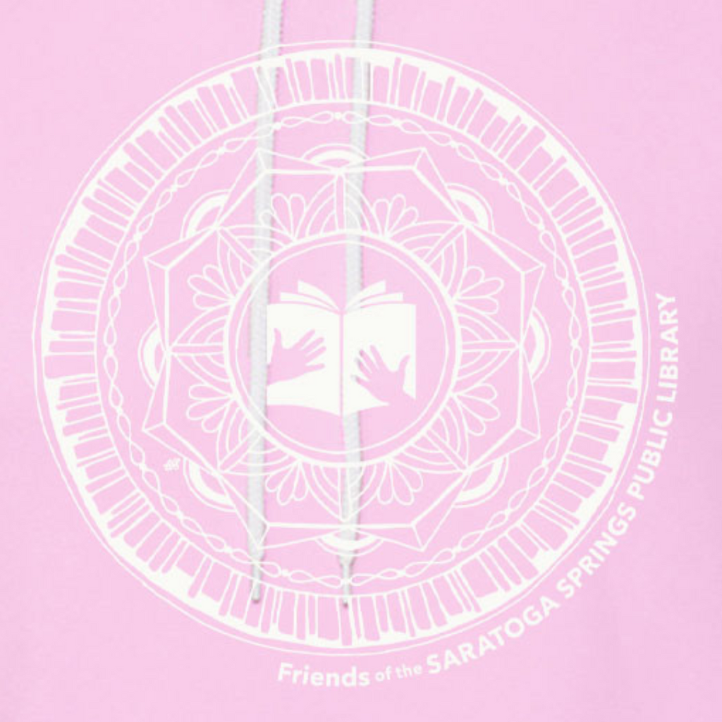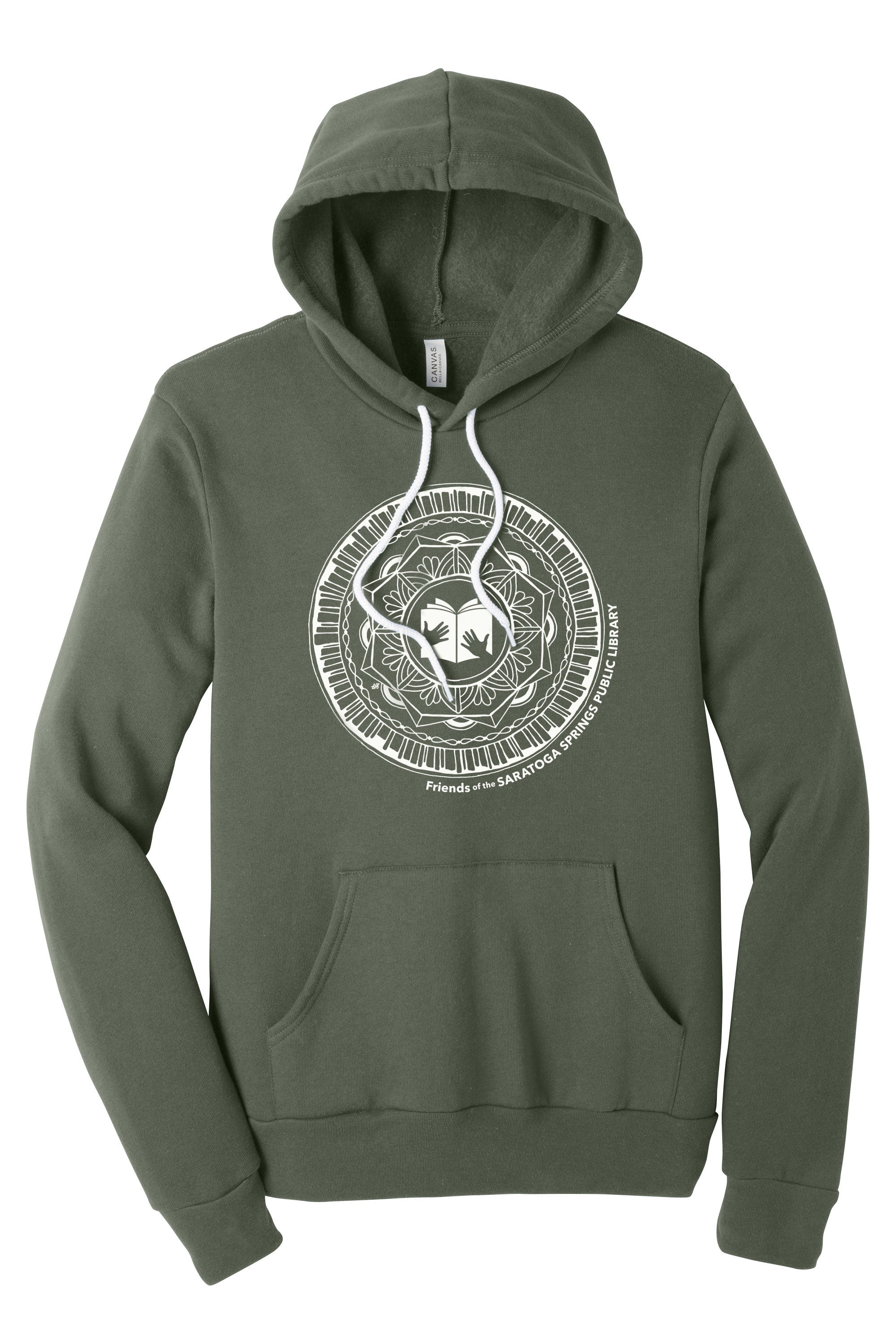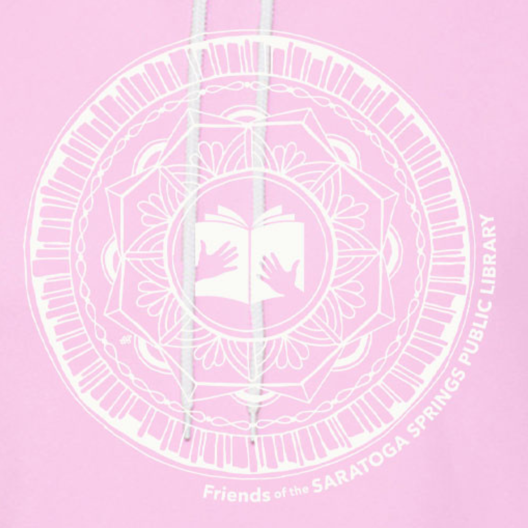 An original mandala design on a cozy hooded sweatshirt... super soft on the inside. A generously sized unisex sweatshirt. Rib knit cuffs and hem. Features an original Friends of Saratoga Springs Public Library design, by local artist, Betsy Seplowitz.