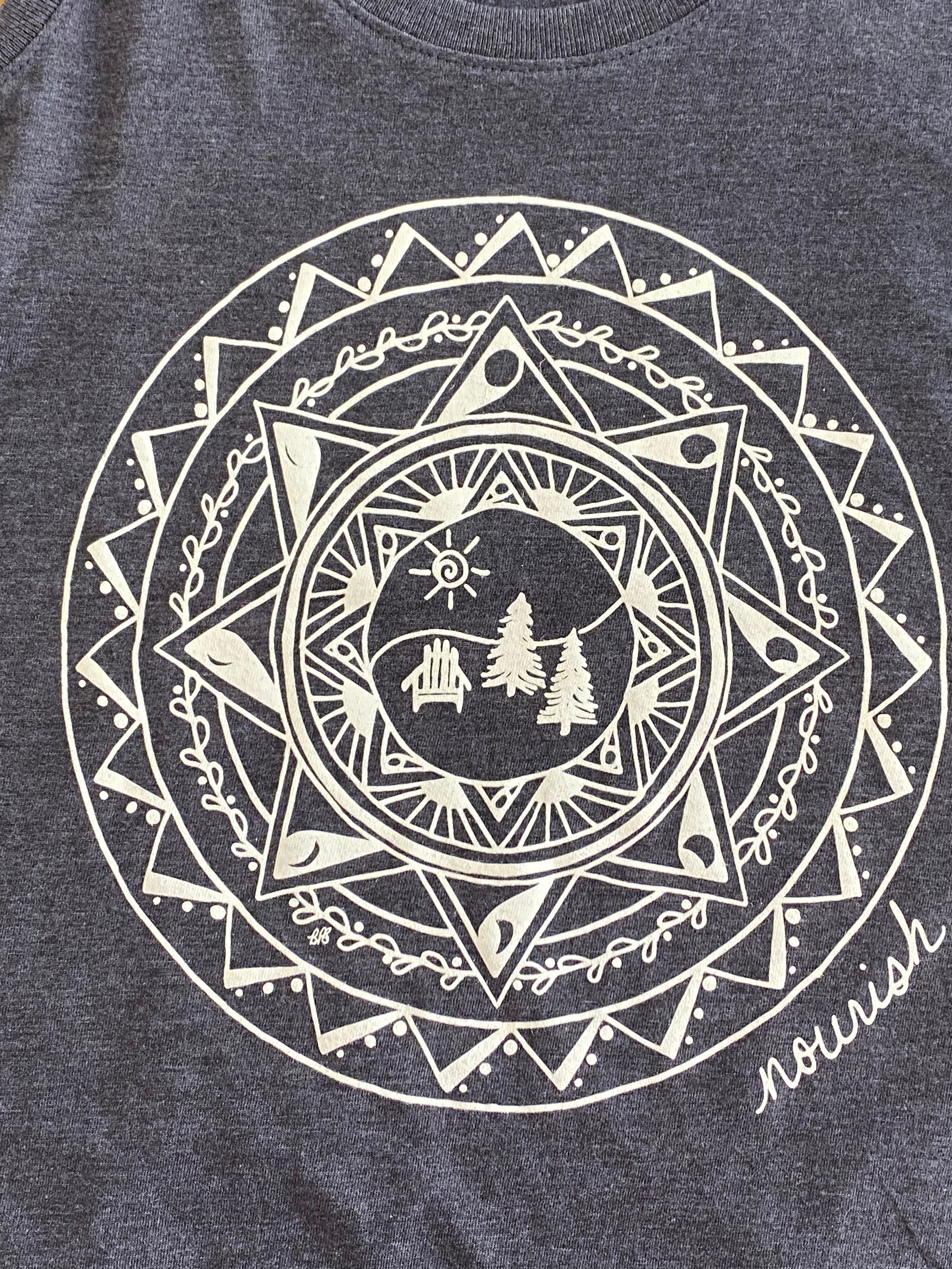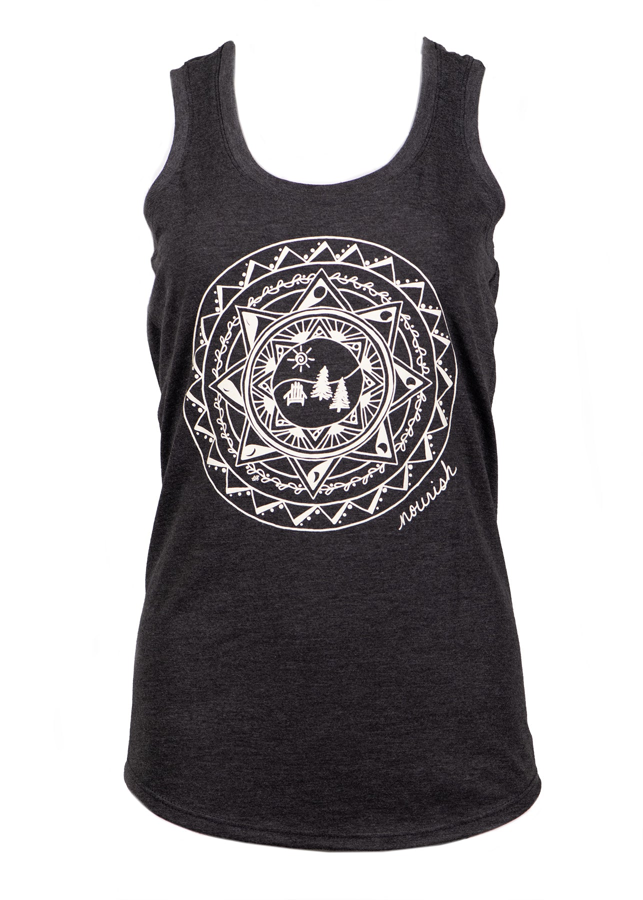 Hand-screened original mandala design in ivory on a charcoal grey tank.