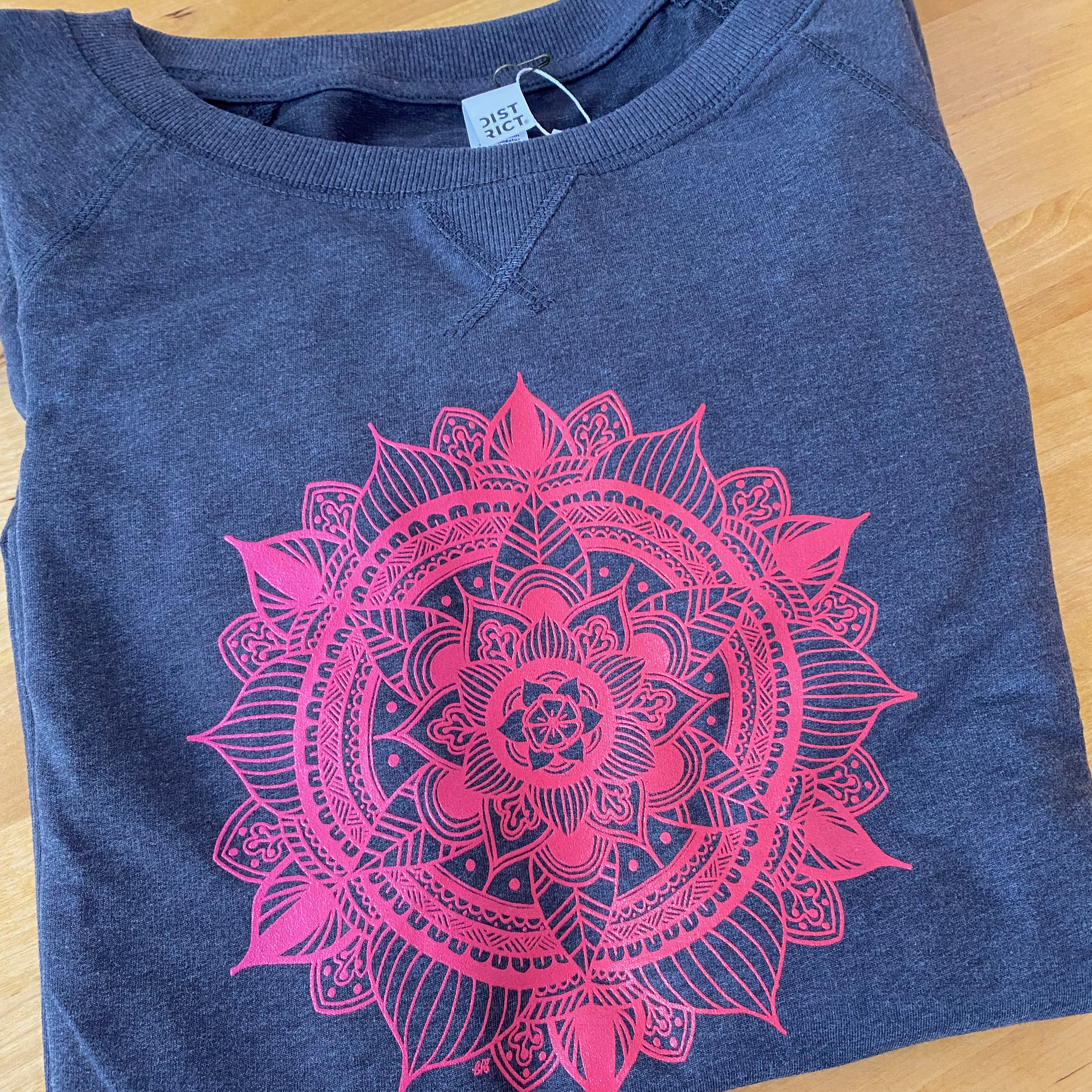 A classic mandala design by Betsy Seplowitz. This shirt is designed specifically for women... built like a sweatshirt but the weight of a tank -shirt. It's super soft. Each one is a unique ombre color combinations as each one is silk-screened by hand.