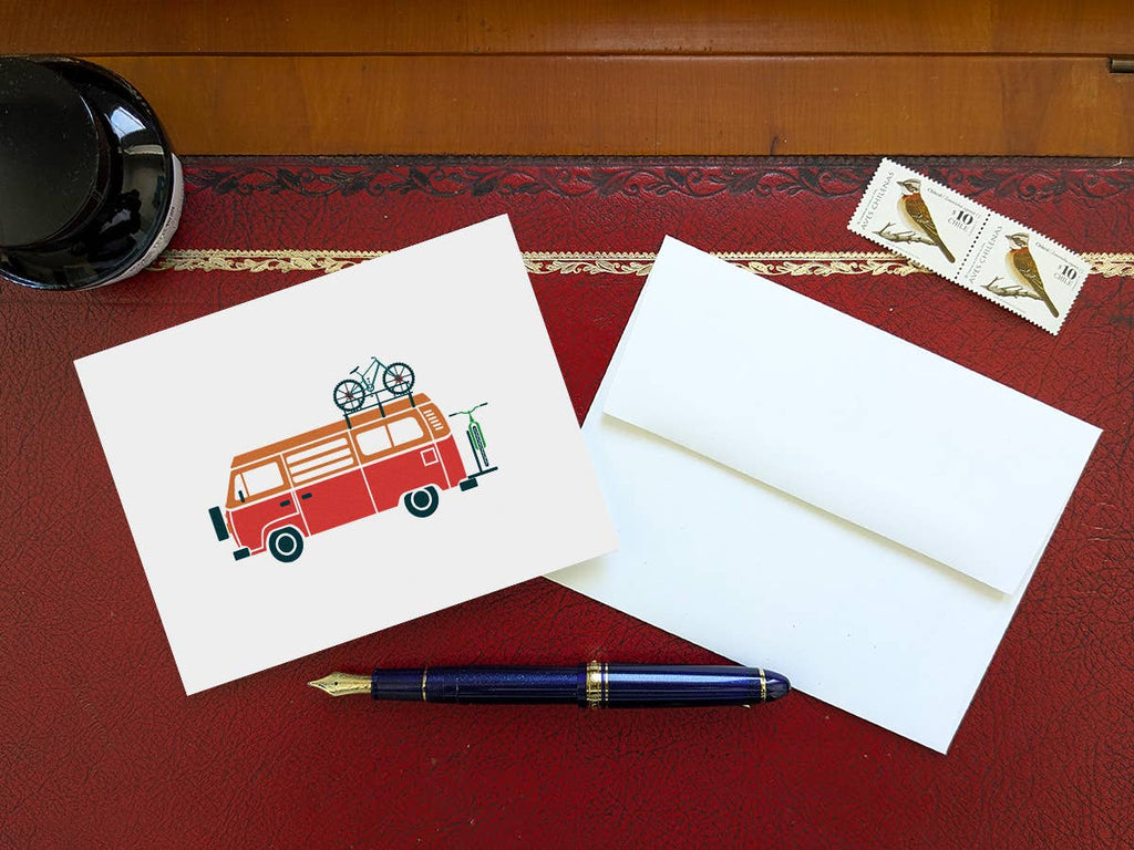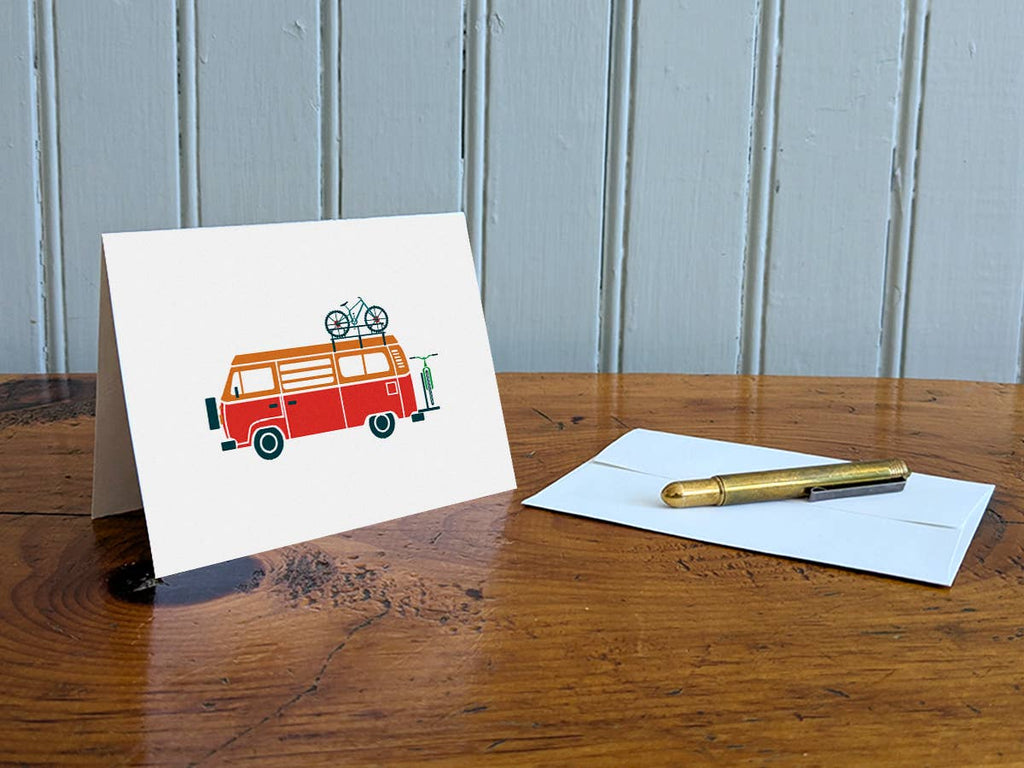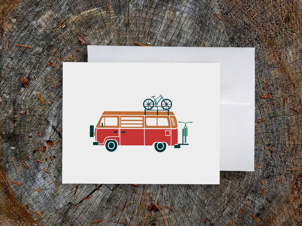 This greeting card features a colorful van equipped with bikes and ready for adventure. Greeting card is blank inside and perfect to write a special note to friends and family.