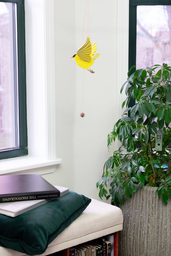 American Goldfinch Flying Mobile - ethically delightful décor for any space from the living room to the lanai! Pull the bottom string and witness the most graceful of dances. Constructed from medium-density fiberboard and hand-painted to perfection. Treat your home to this handcrafted beauty from a woman-owned biz!