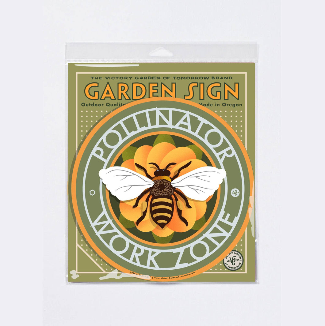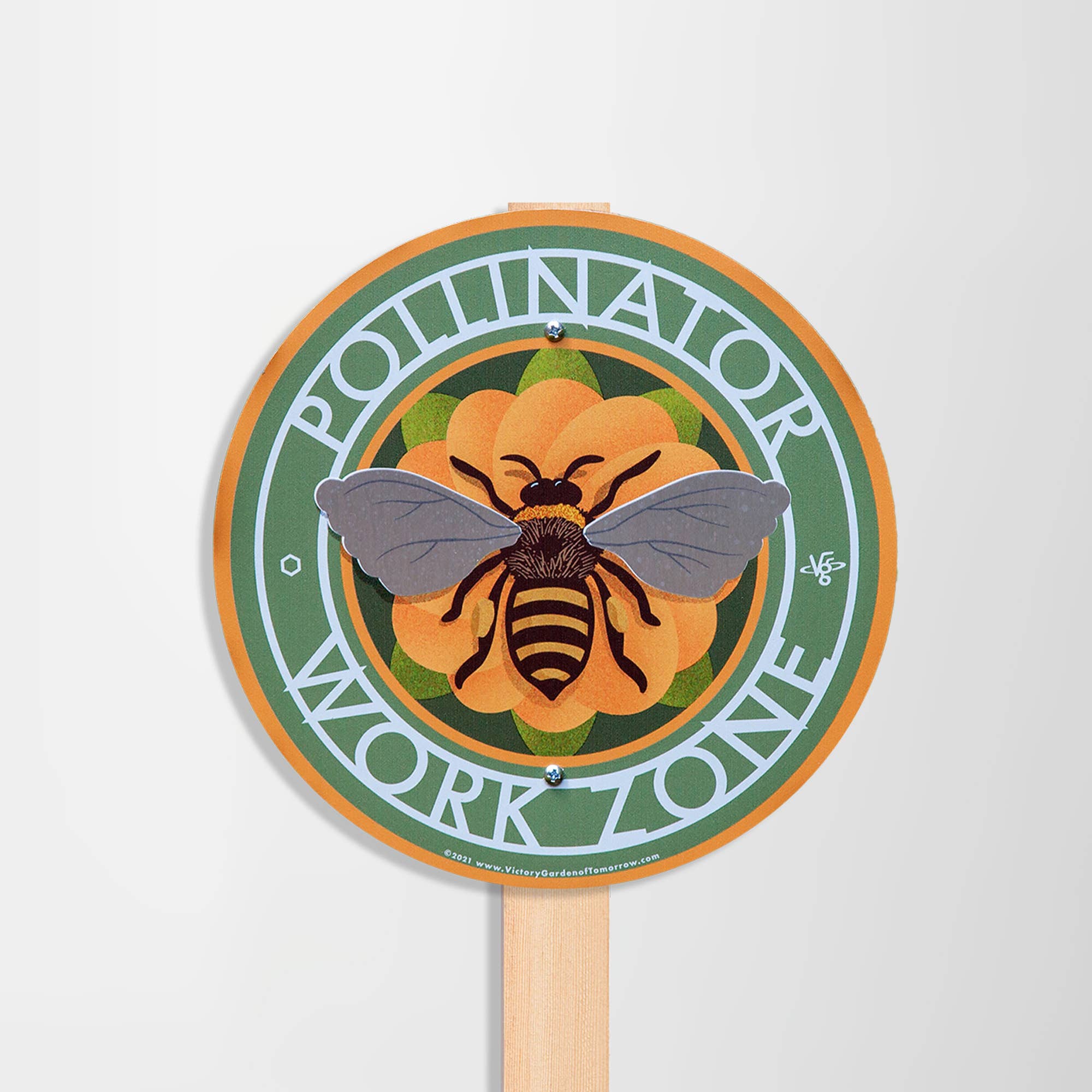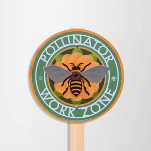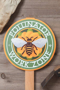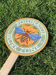 Let others know that you avoid pesticides and cultivate flowering plants to support the important work that pollinators do for us, and make the garden safe for children, animals and insects. Pollinator Work Zone reminds us that our outdoor spaces are nature’s work. This sign’s special feature is the metallic wings on the bee, making an attractive element to the home landscape. Made of a composite aluminum and polyethylene, and printed with a hard-cured ink, this durable sign will last for years outside and in the weather. It will look fine on a stake, on the shed or on the barn. Mounting holes and two screws are provided. Wood stake optional. SIZE: 9 in. dia. MATL: Aluminum-polyethylene sign panel  PRINTED in Portland, Oregon