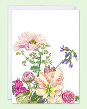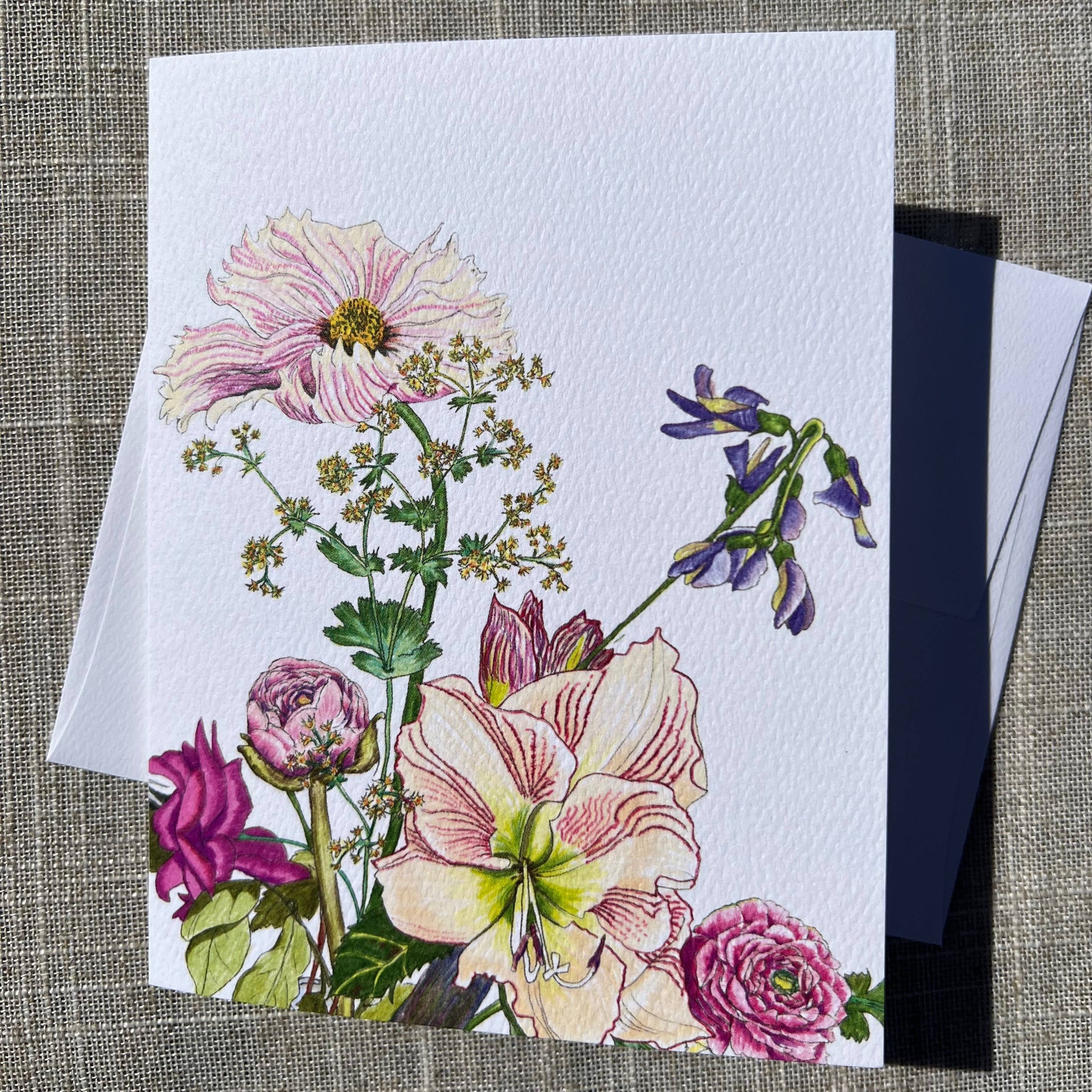 A dramatic close-up catches the eye in this A2-sized folded greeting card. Printed on felt cardstock, it comes with matching envelope. Our NEW 'Lilies & Roses' colored pencil illustration by Westport, CT artist Kerstin Rao graces our newest greeting card. Flowers are amaryllis, ranunculus, peony, cosmos, baptisia, lady’s mantle, and rose. Vivid Cottage cards are designed to become keepsakes, carrying the private messages of customers to their loved ones in a beautiful form. Our stationery is completely produced in Connecticut - from the flowers grown and sold at a farmer's market to drawing the illustrations; from the exceptional digital scanning to the fine printing at a local shop with international reach.