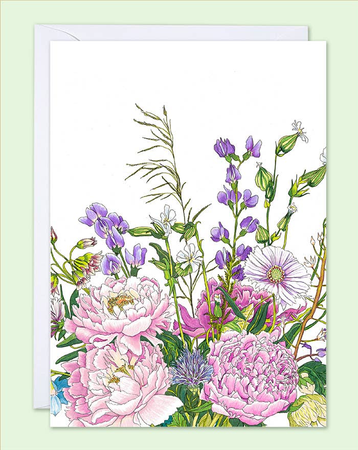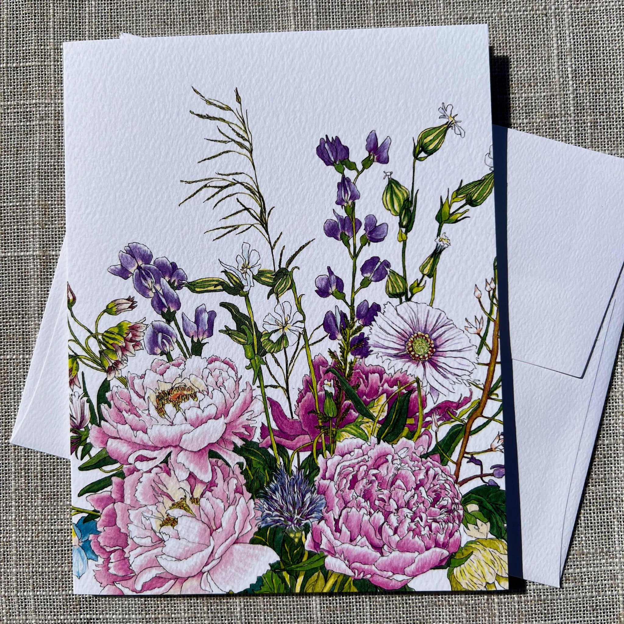 A dramatic close-up catches the eye in this A2-sized folded greeting card. Printed on felt cardstock, it comes with matching envelope. Our NEW 'Resplendent Summer' colored pencil illustration by Westport artist Kerstin Rao graces our newest greeting card. Flowers are Baptisia, Cosmos, Peony, Delphinium, Chive Blossom, and Silene. Vivid Cottage cards are designed to become keepsakes, carrying the private messages of customers to their loved ones in a beautiful form. Our stationery is completely produced in Connecticut - from the flowers grown and sold at a farmer's market to drawing the illustrations; from the exceptional digital scanning to the fine printing at a local shop with international reach.