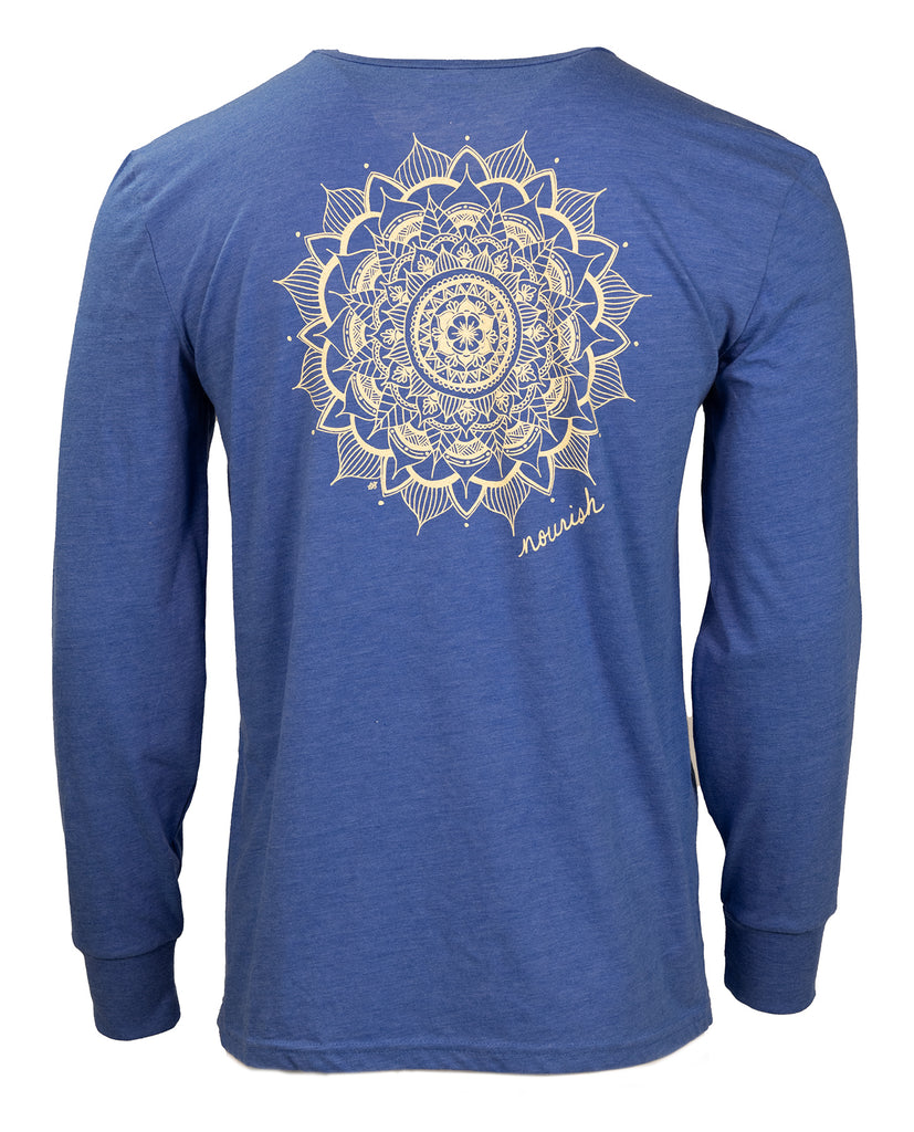 This shirt has a small original design on the left front and a large mandala design on the back.