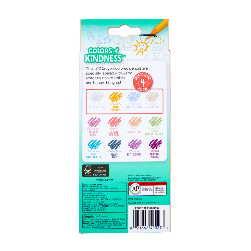 Discover a world of vibrant creativity with Crayola Colors of Kindness Colored Pencils, featuring 12 inspiring shades including Cool Mint (Peace of Mind), Crayellow (Hello Sunshine), Powder Blue (Sky's the Limit), and Oatmeal (A Warm Hug), along with timeless classic colors