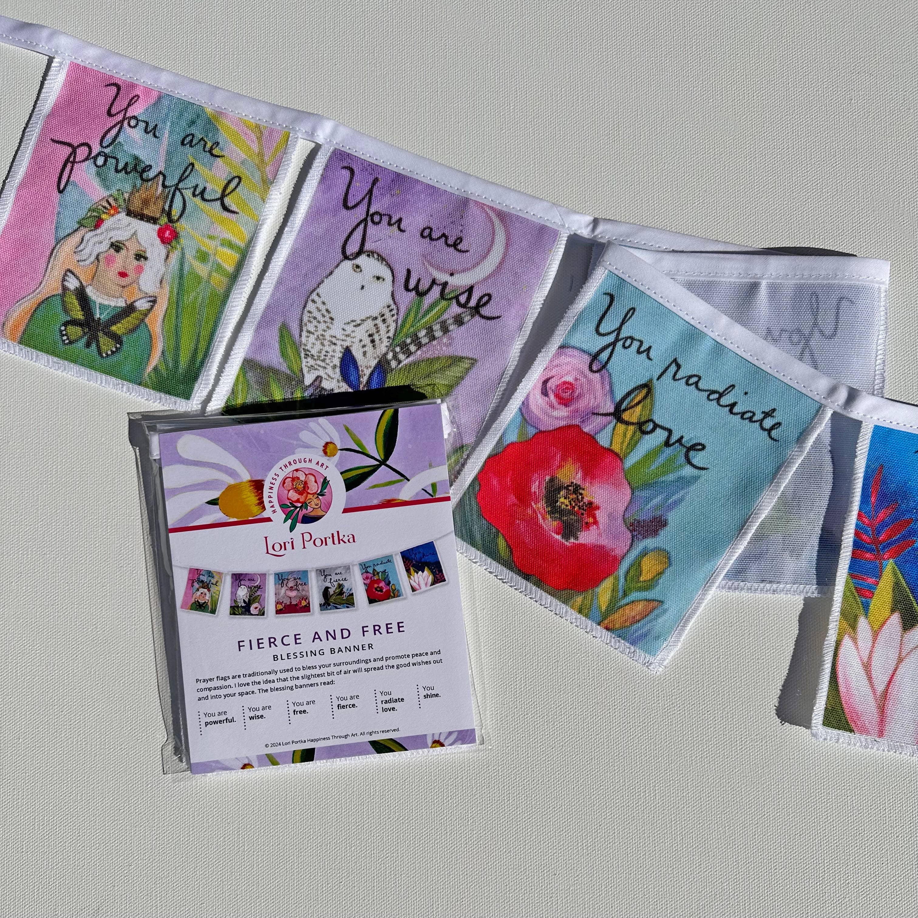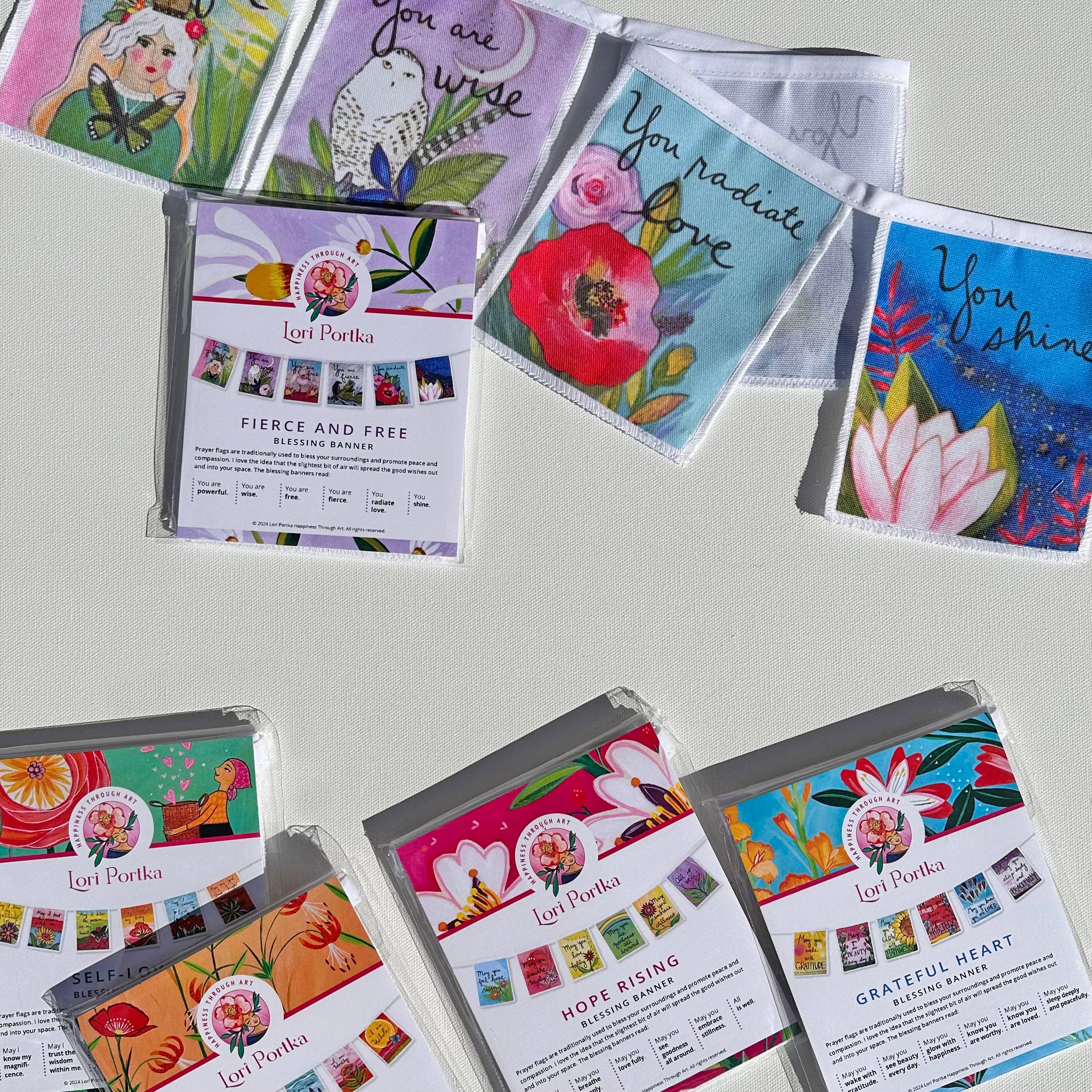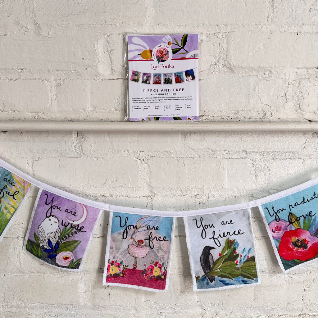 Our banners are inspired by Tibetan prayer flags that are traditionally used to bless your surroundings and promote peace and compassion. I love the idea that even the slightest bit of air will spread good wishes out and into your space.