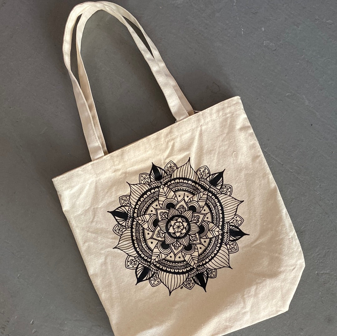 A roomy tote with nice long handles featuring an original, hand-drawn mandala design. The uses for this bag are endless...groceries, library books, knitting projects, toys....the list goes on and on.