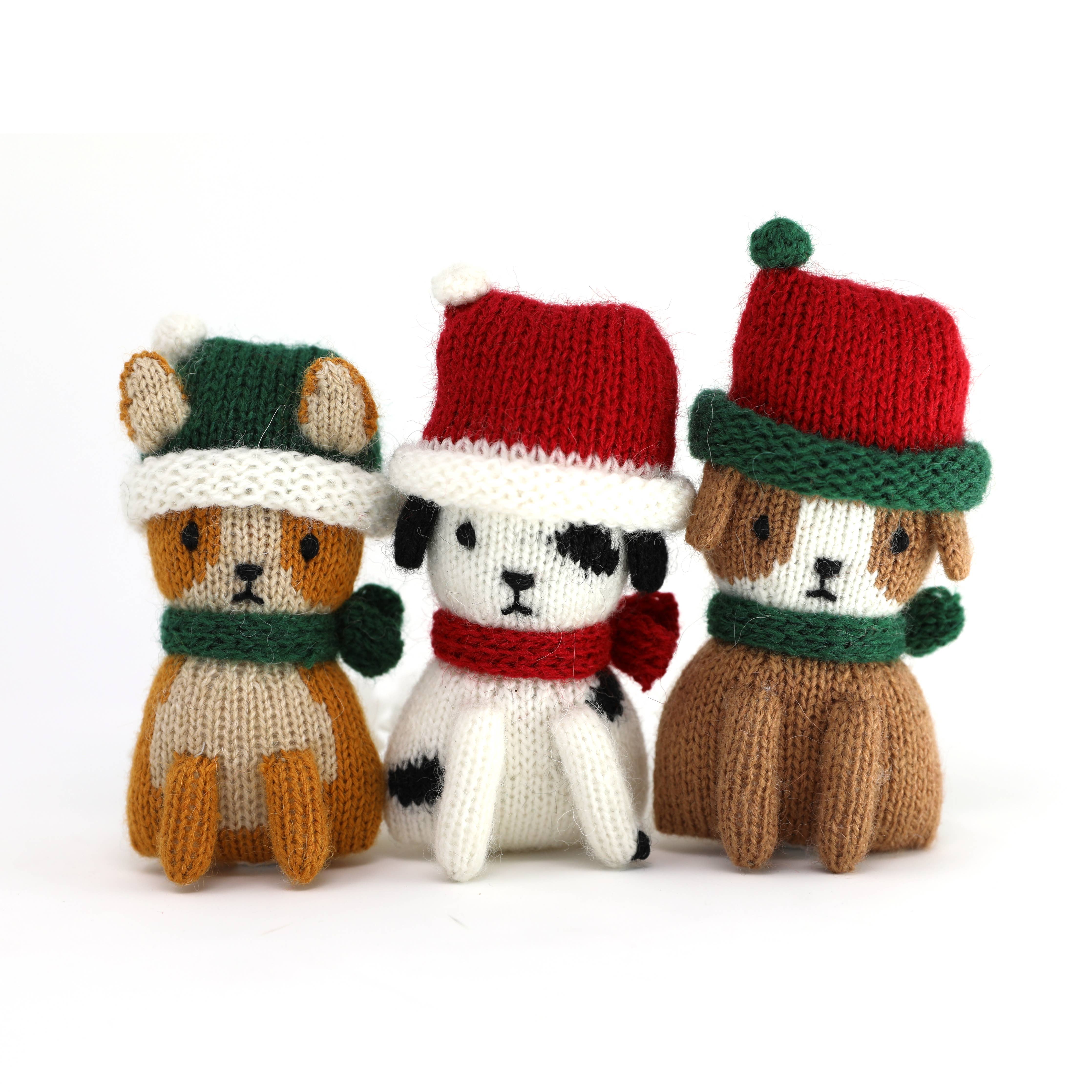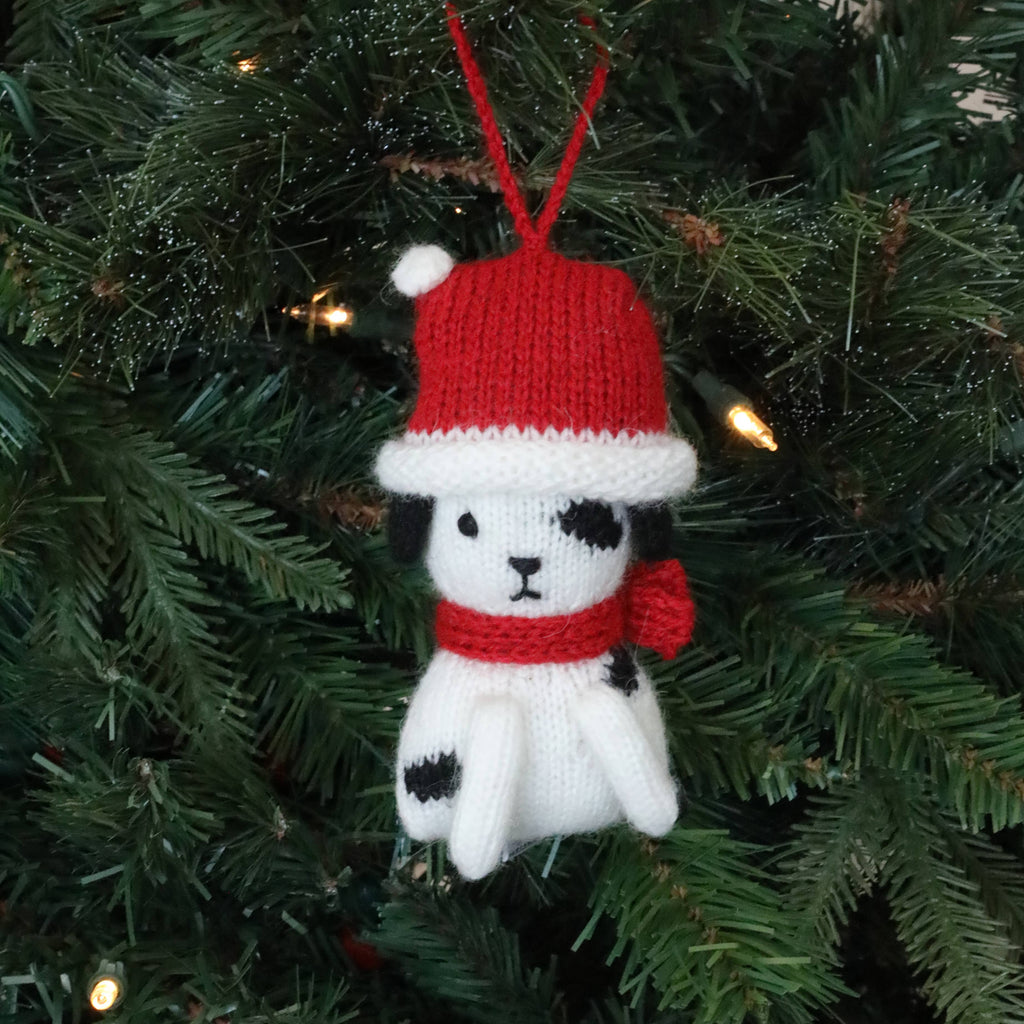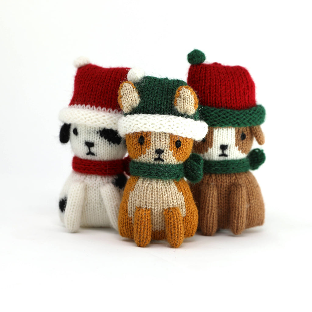 Adorable little puppies with festive stocking caps. Ornaments are priced individually. Photographs show all of the colors/variations included in a case pack. Case pack will include two of each style. 4.5" tall 35% alpaca, 15% wool, 50% acrylic. Filling: 100% polyester Spot clean Handmade, fairly traded Our whimsical designs are handmade by knitting artisans in Lima and in remote rural villages in Peru. We work closely with organizations dedicated to empowering women through income generating projects. They enjoy a safe work environment and earn a living wage with a respect for their cultural traditions.