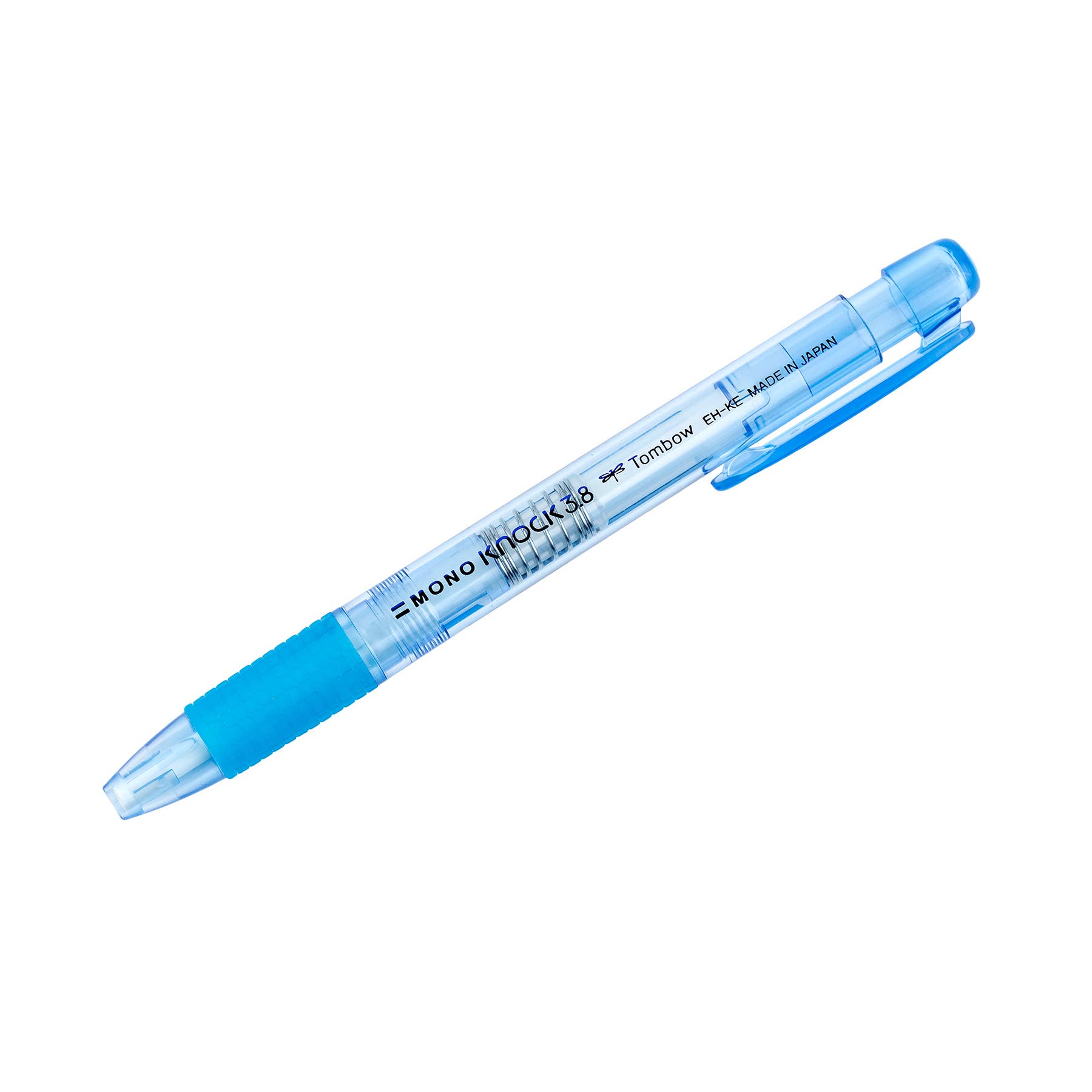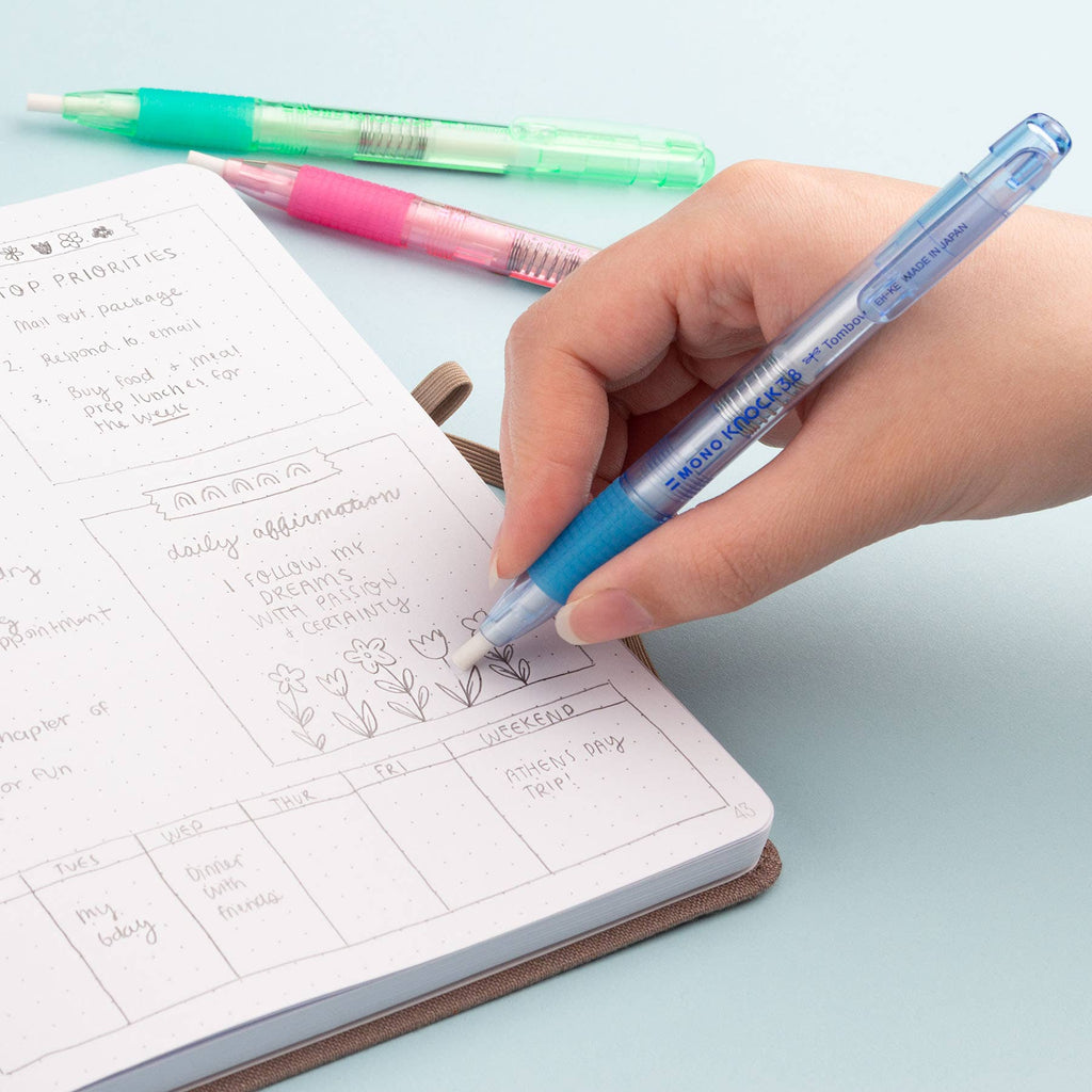 The MONO Knock eraser has a pen-style body that is easy to use and store. Convenient clip for on-the-go corrections. Features a rubber grip for comfortable use. Round; 3.8mm diameter. Available in Pink, Green, and Blue.