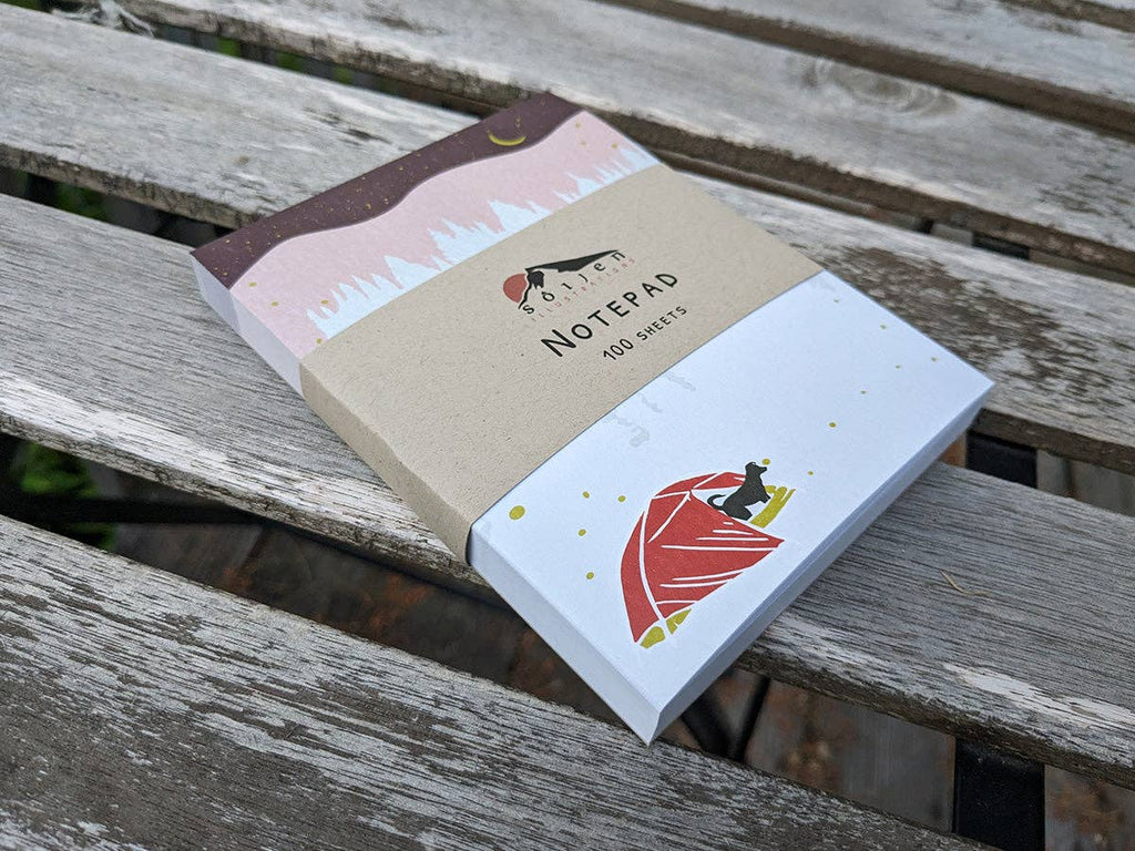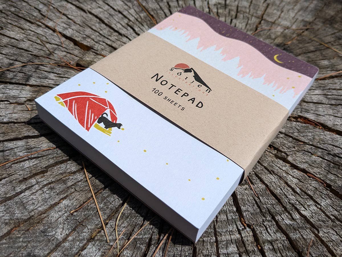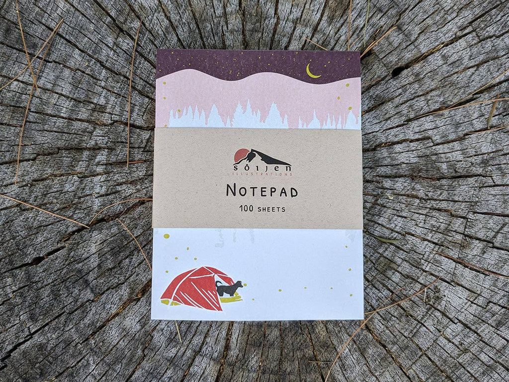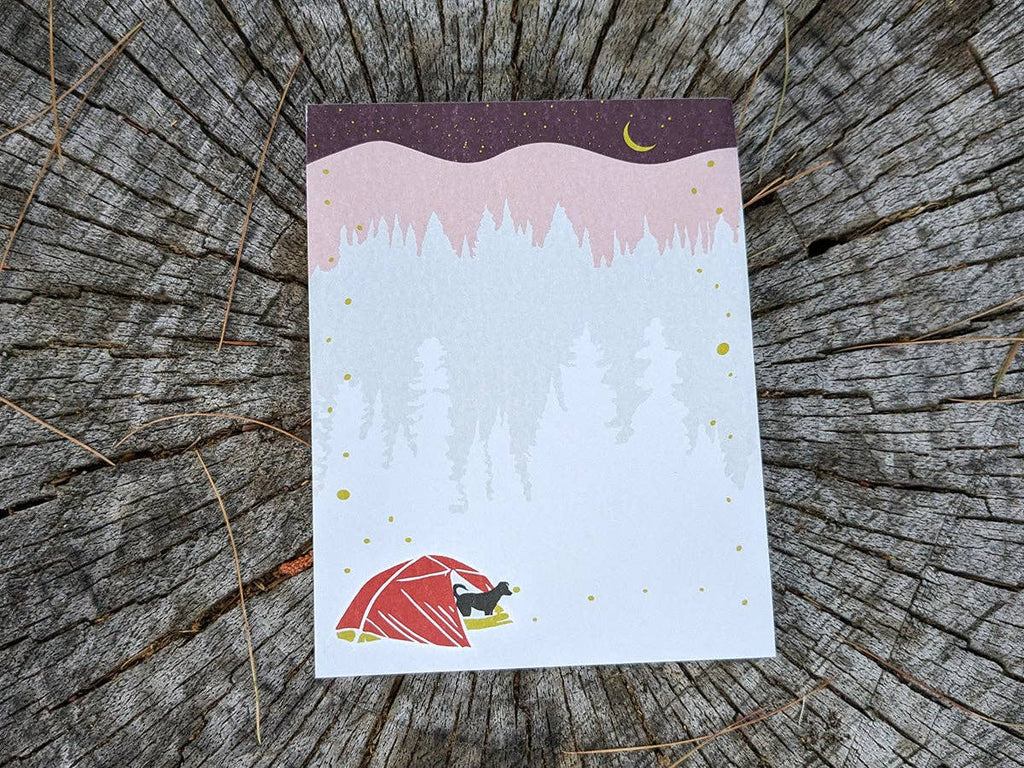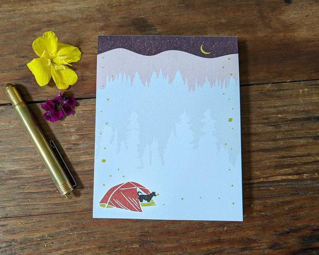 Write down your to-dos with style with our summer camping notepad, featuring an adventure pup camping among fireflies and stars on a warm summer night. Our thick notepads measure 4.25 x 5.5 inches and come with 100 tear-off sheets and cardboard backing. Printed on responsibly forested paper with vegetable-based ink.
