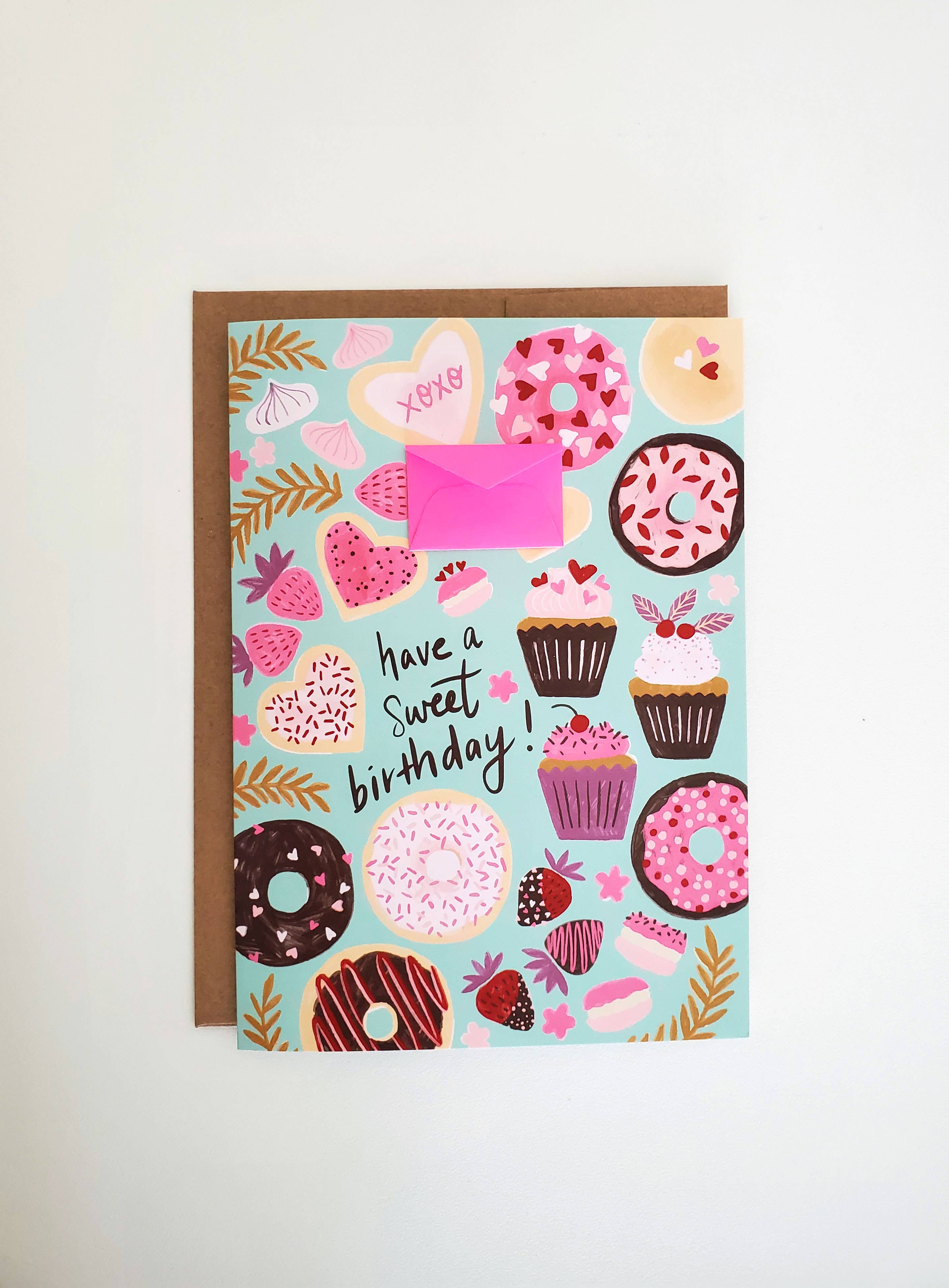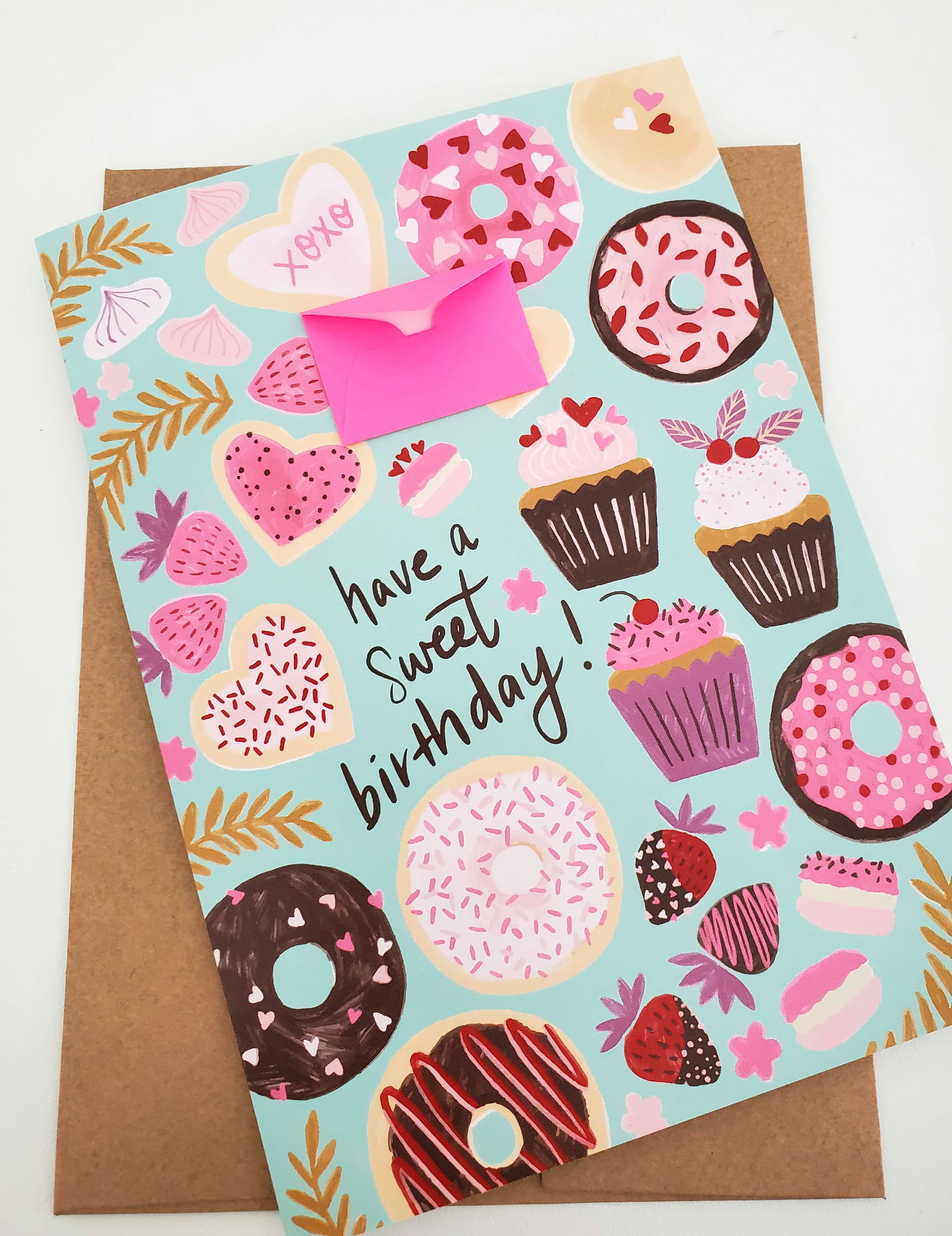 Features illustrations and lettering by hand of cupcakes, donuts and cookies. 1 tiny envelope with a tiny blank card for writing your own messages.