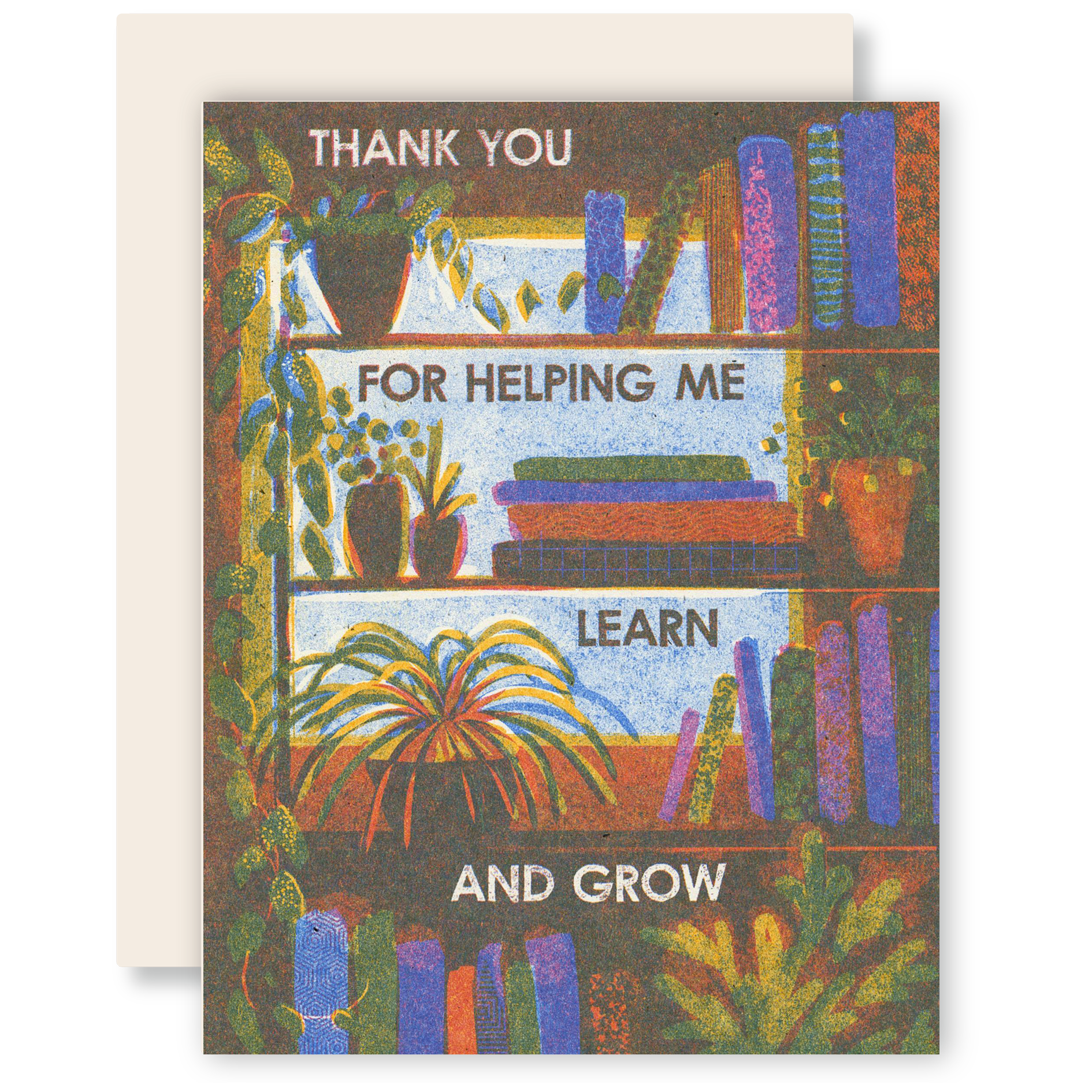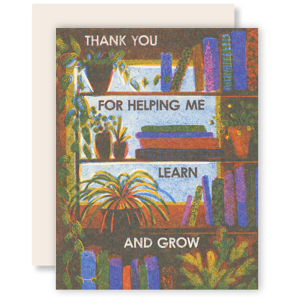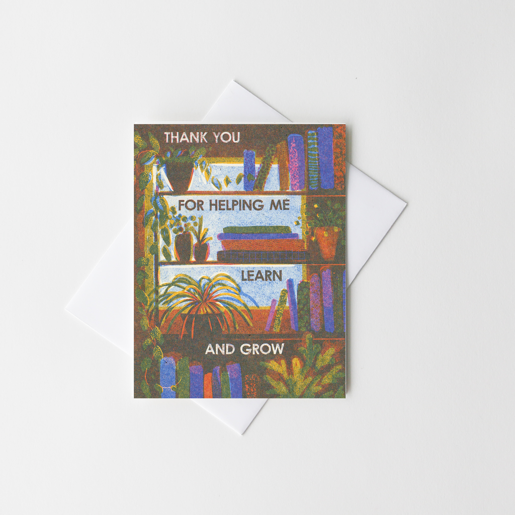 Show appreciation for the mentors in your life who inspire growth and share their wisdom with this illustration of book shelves and house plants bathed in light.