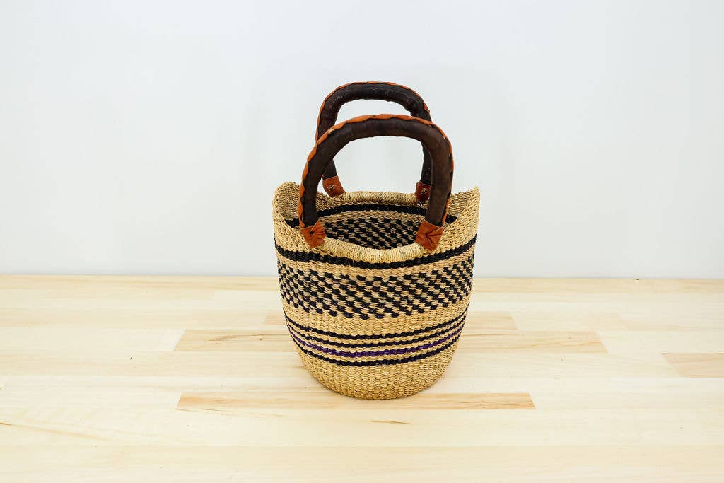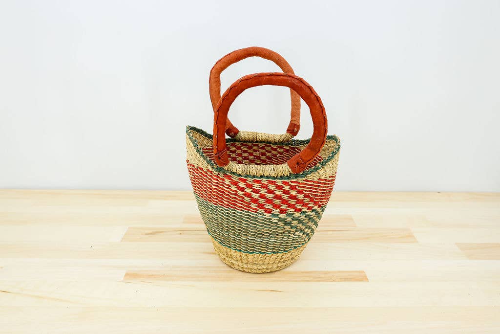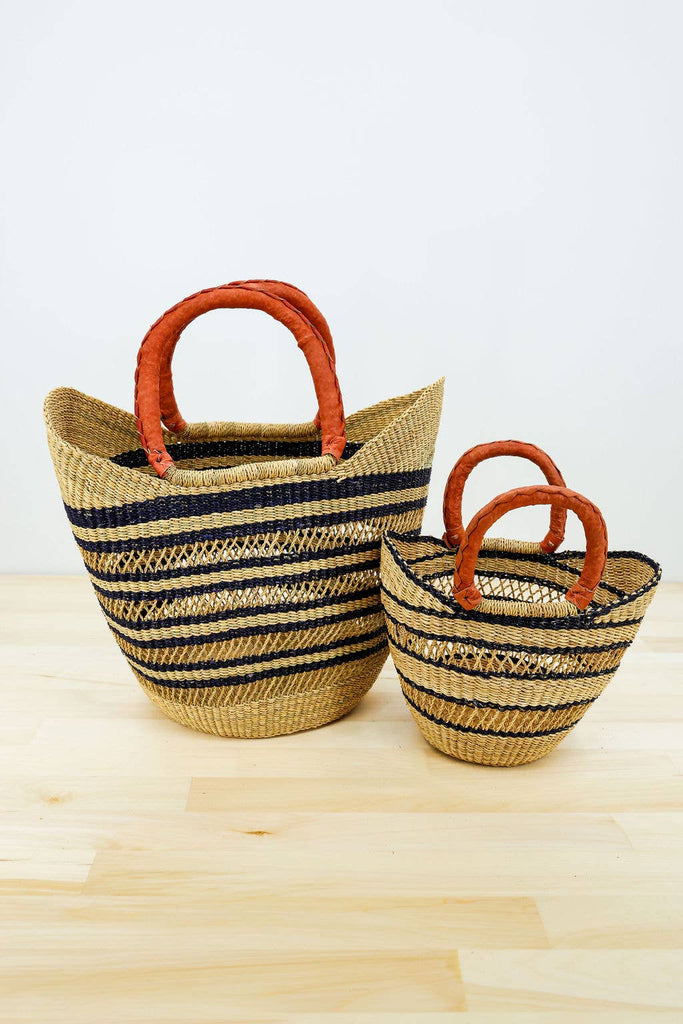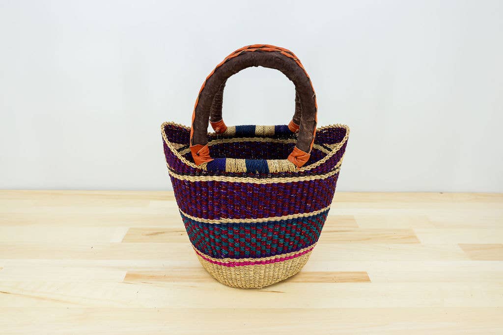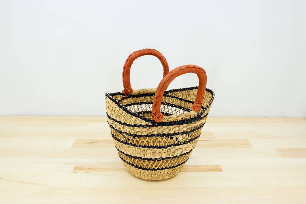Our small fair trade U-shopper grocery tote basket bag/ Bolga Basket is hand dyed and handwoven from Ghanaian dried vetiver grass and comes with sturdy leather handles. It's the perfect size carry-all for in the car, bike basket or even on the go. Comes in single weave, assorted color and assorted weave [open or tight]. Container or utility baskets like these are durable and can be put to multiple uses, such as: a beach bag, carry-on or weekender, crafting or knitting caddy, farmer's market basket, grocery or shopping bag, hamper or laundry basket, handbag or tote, home decor basket, laptop carrier, picnic basket, pot planter, tabletop centerpiece, or for storage, to name a few! Vetiver grass, also known as elephant grass, aids in soil and water conservation, helping smallholder farmers with environmental rehabilitation efforts. Dimensions: diameter 12"-14"; depth 7"-8" Materials: vetiver grass, leather