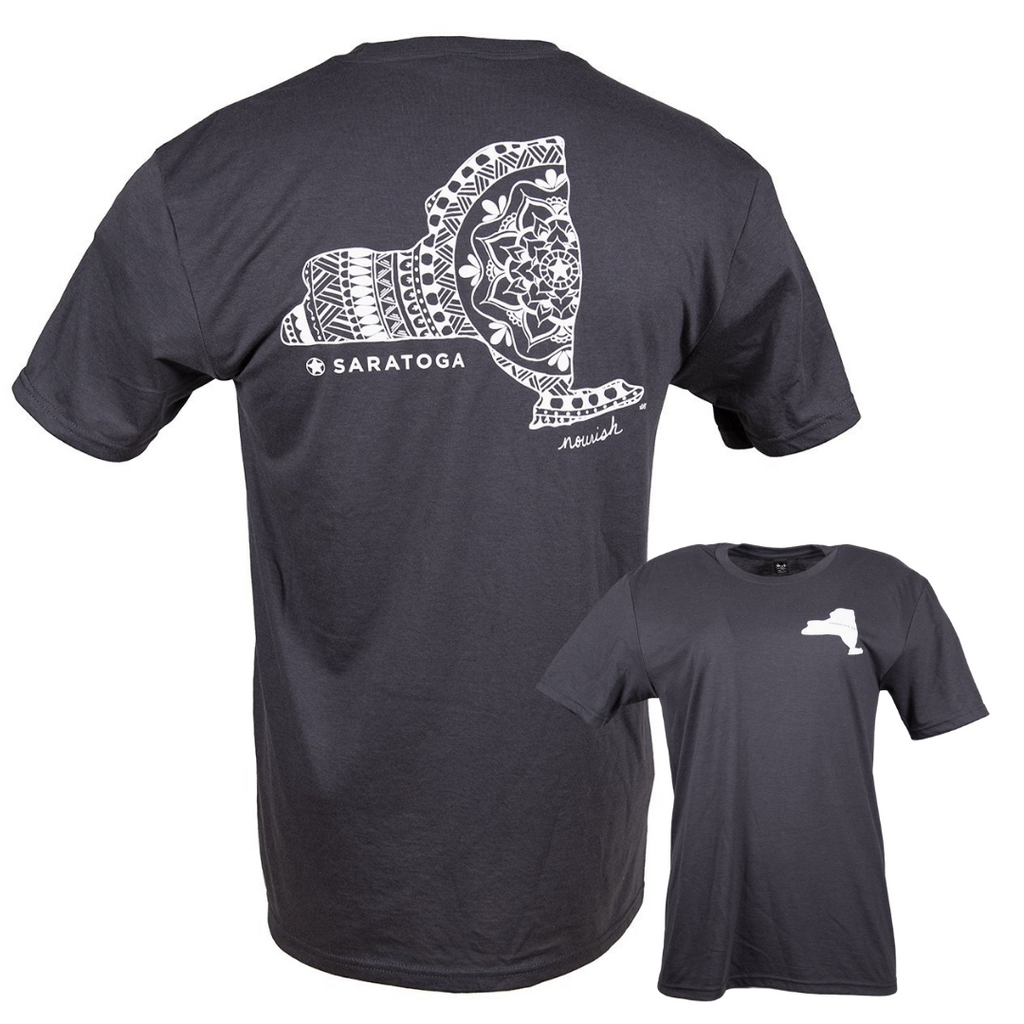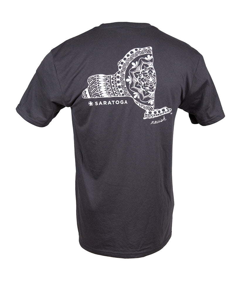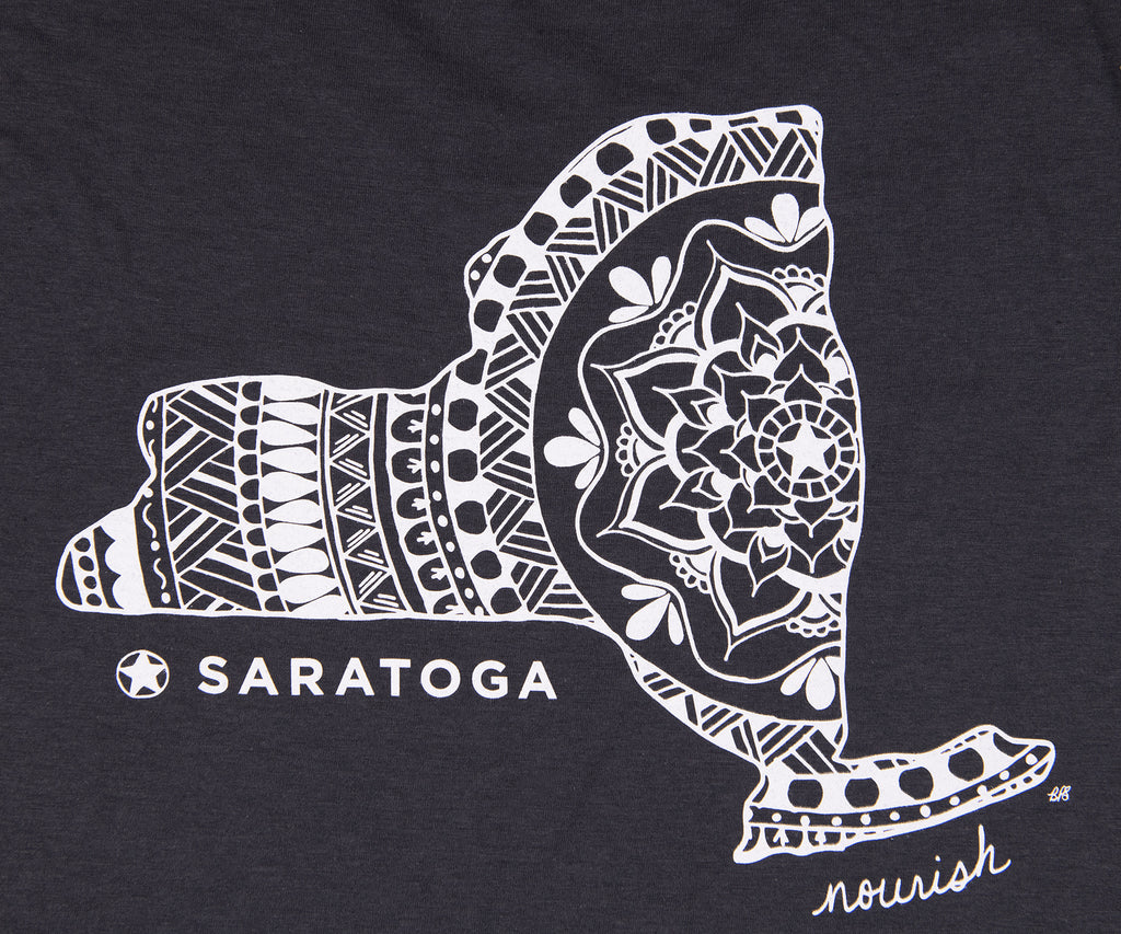 A custom mandala inspired by a New York State Map with Saratoga Springs at the center of the mandala. The back of the shirt features the mandala design and the front "pocket" has a New York State silhouette. It's super soft and the color goes with everything. You are going to love it! Unisex sizing.