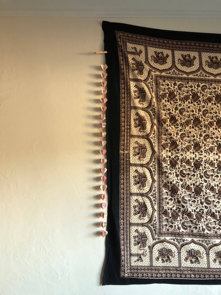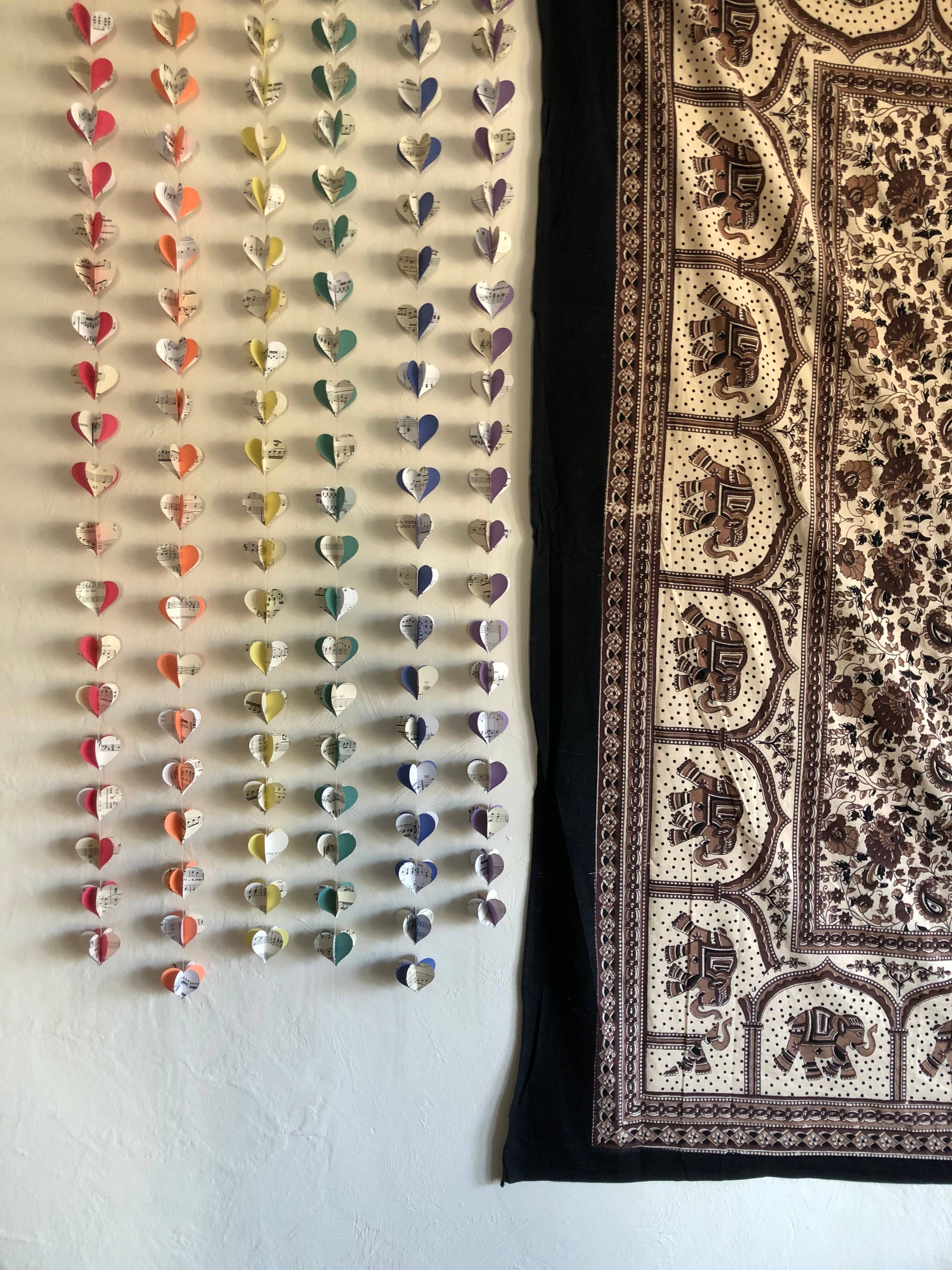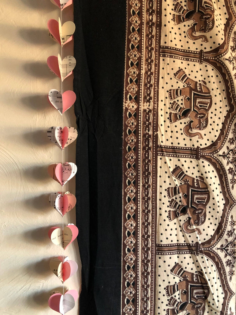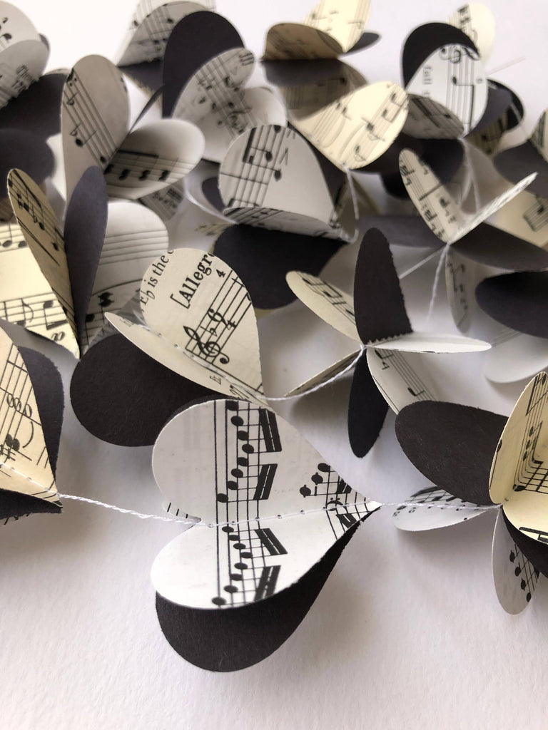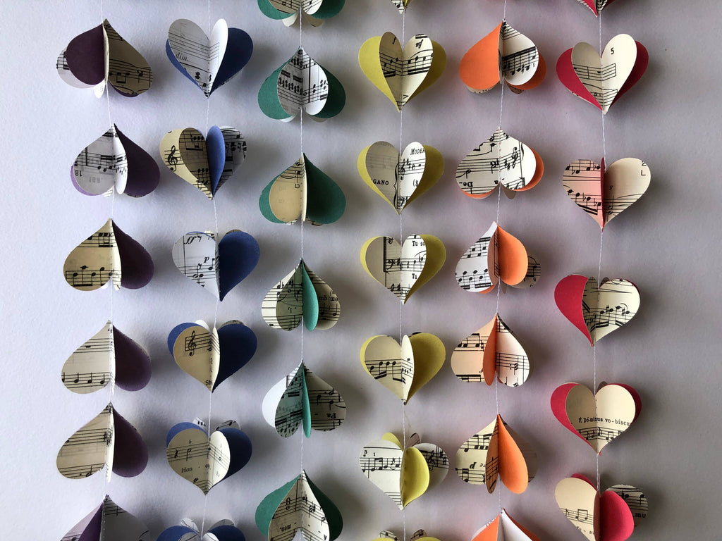 Vintage sheet music and colorful paper are transformed into these delicate vertical paper heart garlands. Reusable! Each vertical garland measures about 40” long and is made of 60 hearts tripled up so they can be folded back to create 20 3D shapes. They have been machine stitched. Each heart measures 1.5 inches high x 2 inches wide. The color will vary based on the vintage sheet music and colored papers that I have on hand. They will ship flat, packaged in a cello bag, and have about 4 inches of thread knotted at each end so they are ready to hang!